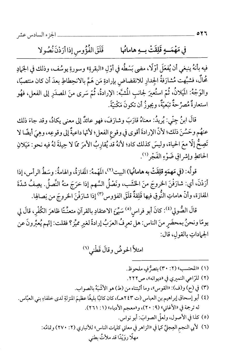 قال الصولي: كان أبو فراس سيء الاعتقاد بالقرآن متعنتاً ظاهر الكفر، قال لي يوماً ونحنُ بمحضر من الناس: هل تعرفُ العرب إرادة لغير مميز؟ فقلت: إنهم يعبرون عن الجمادات بالقول، قال: