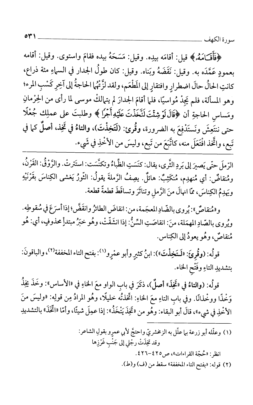 (فَأَقامَهُ) قيل: أقامه بيده. وقيل: مسحه بيده فقام واستوي. وقيل: أقامه بعمود عمده به. وقيل: نقضه وبناه. وقيل كان طول الجدار في السماء مائة ذراع، كانت الحال حال اضطرار وافتقار إلى المطعم، وقد لزتهما الحاجة إلى آخر كسب المرء؛ وهو المسألة، فلم يجدا مواسيا، فلما أقام الجدار لم يتمالك موسى لما رأى من الحرمان ومساس الحاجة أن (قالَ لَوْ شِئْتَ لَاتَّخَذْتَ عَلَيْهِ أَجْراً) وطلبت على عملك جعلا حتى ننتعش ونستدفع به الضرورة وقرئ: (لتخذت)، والتاء في تخذ، أصل كما في تبع، واتخذ افتعل منه، كاتبع من تبع، وليس من الأخذ في شيء.