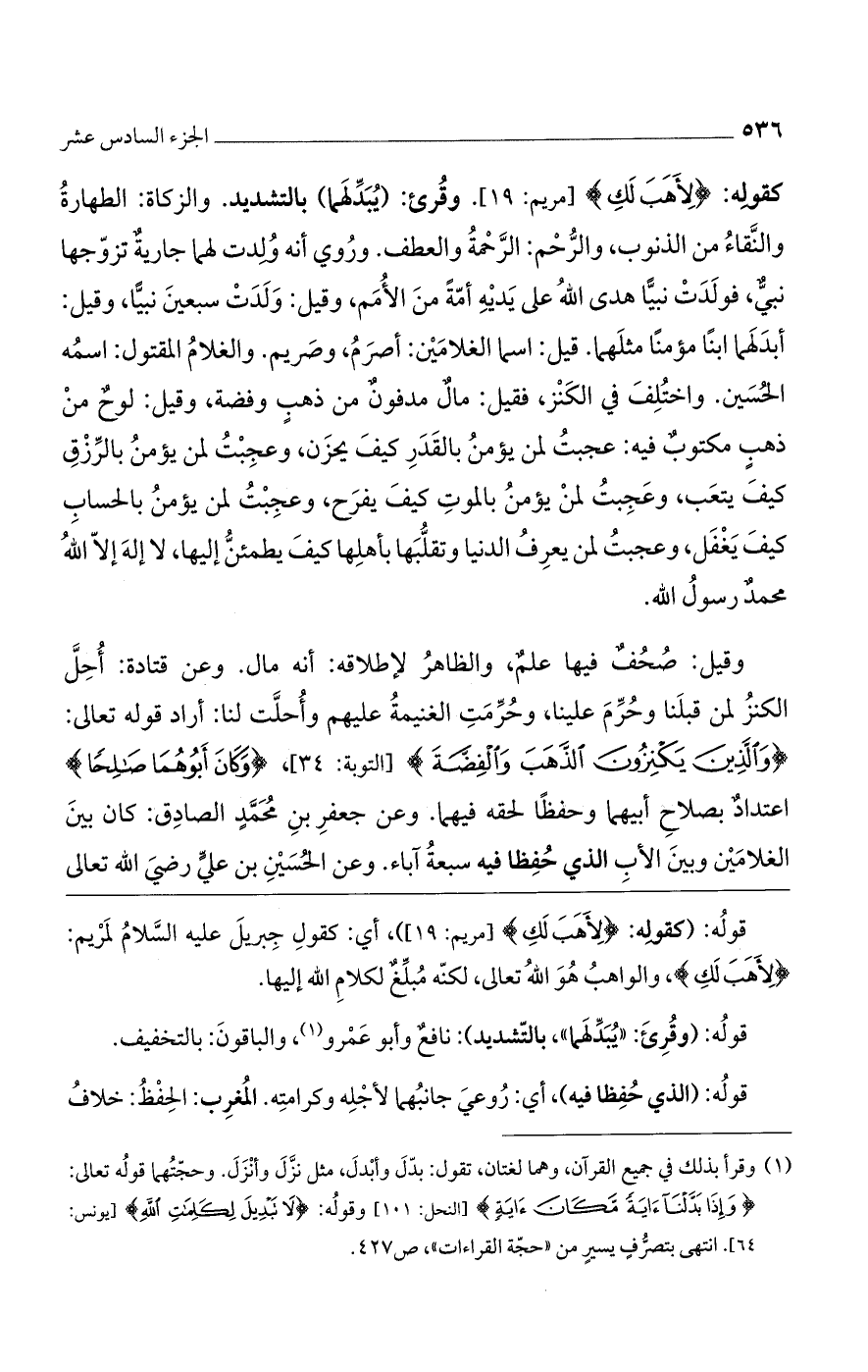 كقوله: (لِأَهَبَ لَكِ) [مريم: 19]. وقرئ: (يبدّلهما) بالتشديد. والزكاة: الطهارة والنقاء من الذنوب، والرحم: الرحمة والعطف. وروى أنه ولدت لهما جارية تزوّجها نبي، فولدت نبيا هدى الله على يديه أمّة من الأمم، وقيل: ولدت سبعين نبيا، وقيل: أبدلهما ابنا مؤمنا مثلهما. قيل: اسما الغلامين: أصرم، وصريم. والغلام المقتول: اسمه الحسين. واختلف في الكنز، فقيل: مال مدفون من ذهب وفضة، وقيل: لوح من ذهب مكتوب فيه: عجبت لمن يؤمن بالقدر كيف يحزن، وعجبت لمن يؤمن بالرزق كيف يتعب، وعجبت لمن يؤمن بالموت كيف يفرح، وعجبت لمن يؤمن بالحساب كيف يغفل، وعجبت لمن يعرف الدنيا وتقلبها بأهلها كيف يطمئن إليها، لا إله إلا الله محمد رسول الله.