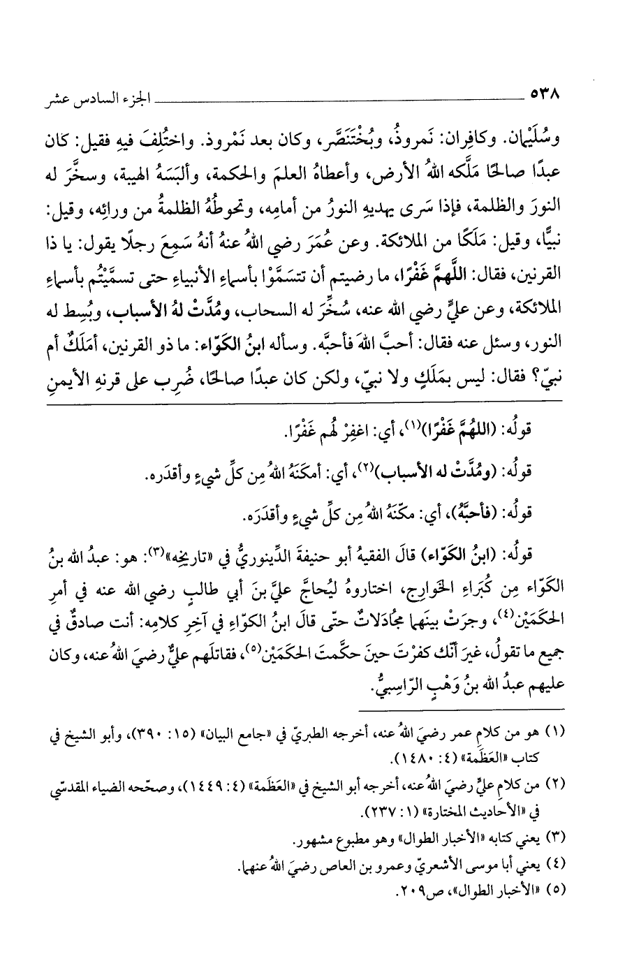 قوله: (ابن الكواء) قال الفقيه أبو حنيفة الدينوري في "تاريخه": هو: عبد الله بن الكواء من كبراء الخوارج، اختاروه ليحاج علي بن أبي طالب رضيا لله عنه في أمر الحكمين، وجرت بينهما مجادلات حتى قال ابن الكواء في آخر كلامه: أنت صادقٌ في جميع ما تقول، غير انك كفرت حين حكمت الحكمين، فقاتلهم عليٌّ رضي الله عنه، وكان عليهم عبد الله بن وهب الراسبي.