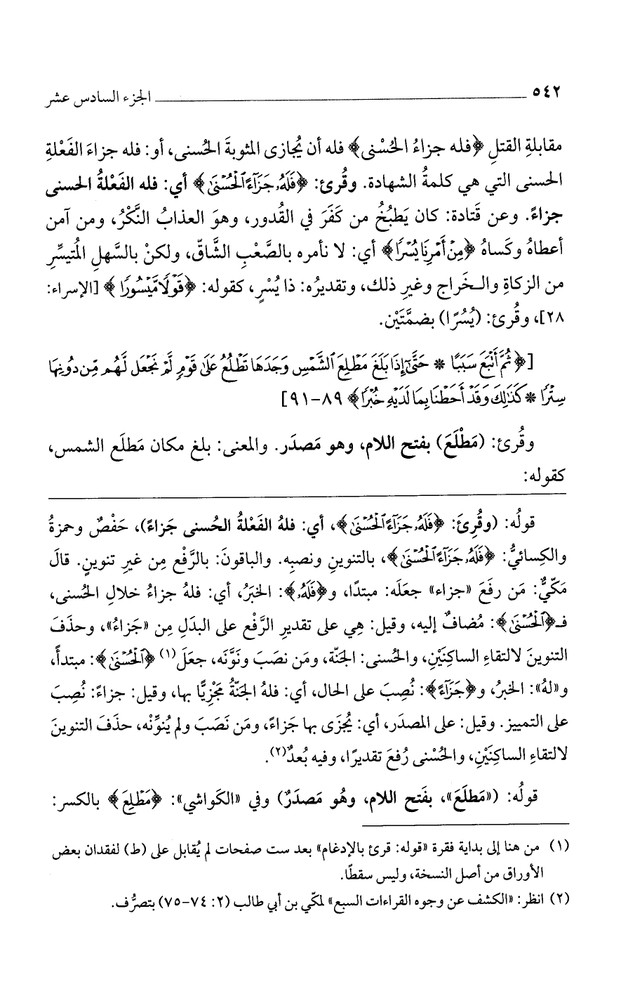 قوله: (وقرئ: (فَلَهُ جَزَاءً الْحُسْنَى)، أي: فله الفعلة الحسنى جزاء)، حفصٌ وحمزة والكسائي: (فَلَهُ جَزَاءً الْحُسْنَى)، بالتنوين ونصبه. والباقون: بالرفع من غير تنوين. قال مكي: من رفع "جزاء" جعله: مبتدا، و (فَلَهُ): الخبر، أي: فله جزاءُ خلال الحُسنى، فـ (الْحُسْنَى): مضافٌ إليه، وقيل: هي على تقدير الرفع على البدل من "جزاء"، وحذف التنوين لالتقاء الساكنين، والحسنى: الجنةن ومن نصب ونونه، جعل (الْحُسْنَى): مبتدأ، و"لهُ": الخبرُ، و (جَزَاءُ): نُصب على الحال، أي: فله الجنة مجزياً بها، وقيل: جزاء: نُصب على التمييز. وقيل: على المصدر، أي: يجزى بها جزاء، ومن نصب ولم ينونه، حذف التنوين لالتقاء الساكنين، والحسنى رُفع تقديراً، وفيه بُعدٌ.