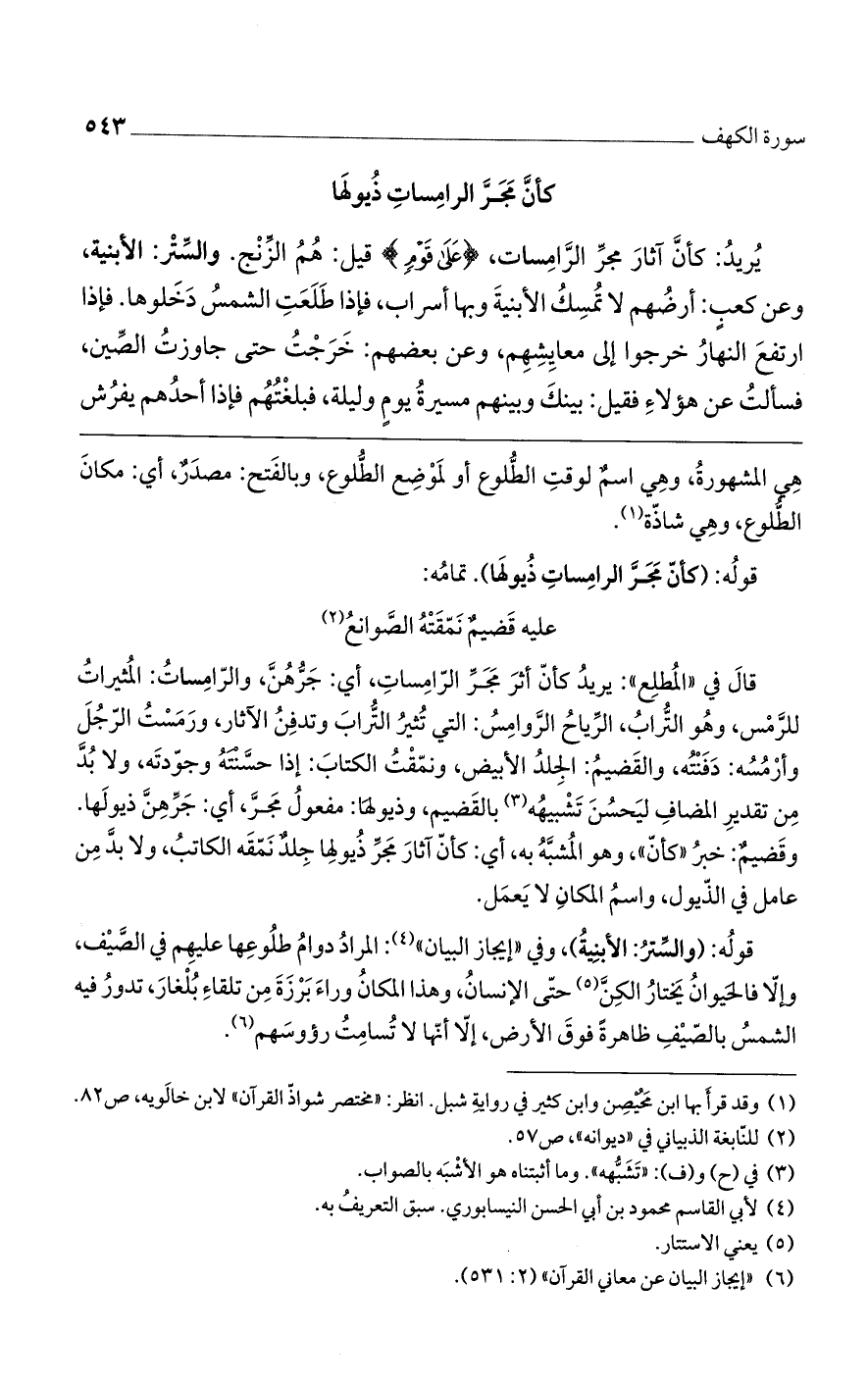 قال في "المطلع": يريد كأن أثر مجر الرامسات، أي: جرهن، والرامساتُ: المثيرات للرمس، وهو الترابُ، الريا الروامس: التي تُثيرُ التراب وتدفن الآثار، ورمست الرجل وأرمسه: دفنته، والقضيم: الجلد الأبيض، ونمقت الكتاب: إذا حسنته وجودته، ولابد من تقديرالمضاف ليحسن تشبيهه بالقضيم، وذيولها: مفعول مجر، أي: جرهن ذيولها. وقضيم: خبرُ "كأن"، وهو المشبه به، أي: كأن آثار مجر ذيولها جلدٌ نمقه الكاتب، ولابد من عامل في الذيول، واسم المكان لا يعمل.