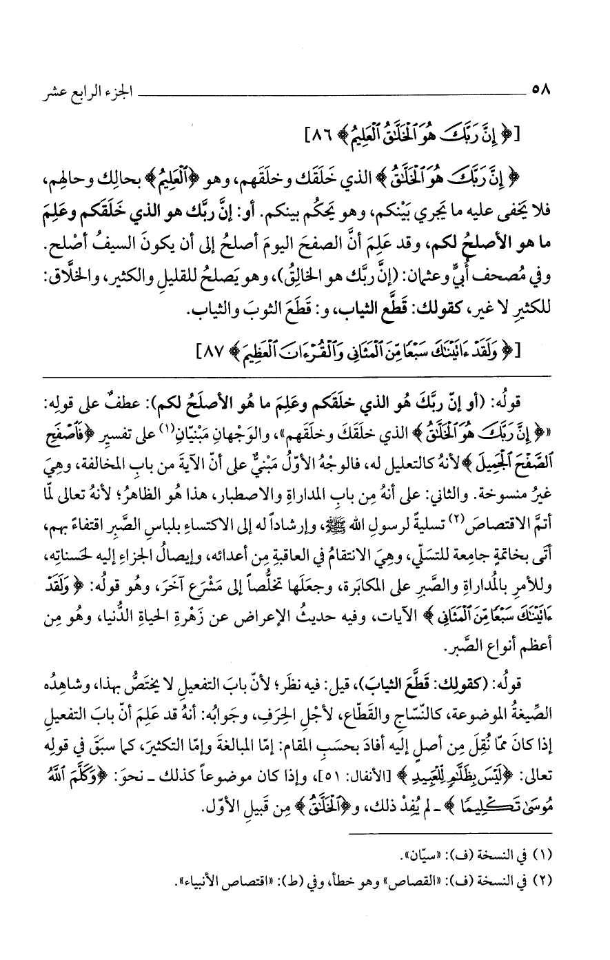 قوله: (أو إن ربك هو الذي خلقكم وعلم ما هو الأصلح لكم): عطف على قوله: " (إِنَّ رَبَّكَ هُوَ الْخَلاَّقُ) الذي خلقك وخلقهم"، والوجهان مبنيان على تفسر (فَاصْفَحْ الصَّفْحَ الْجَمِيلَ) لأنه كالتعليل له، فالوجه الأول مبني على أن الآية من باب المخالفة، وهي غير منسوخة. والثاني: على أنه من باب المداراة والاصطبار، هذا هو الظاهر؛ لأنه تعالى لما أتم الاقتصاص تسلية لرسول الله صلى الله عليه وسلم، وإرشاداً له إلى الاكتساء بلباس الصبر اقتفاء بهم، أتى بخاتمة جامعة للتسلي، وهي الانتقام في العاقبة من أعدائه، وإيصال الجزاء إليه لحسناته، وللأمر بالمداراة والصبر على المكابرة، وجعلها تخلصاً إلى مشرع آخر، وهو قوله: (وَلَقَدْ آتَيْنَاكَ سَبْعاً مِنْ الْمَثَانِي) الآيات، وفيه حديث الإعراض عن زهرة الحياة الدنيا، وهو من أعظم أنواع الصبر.
