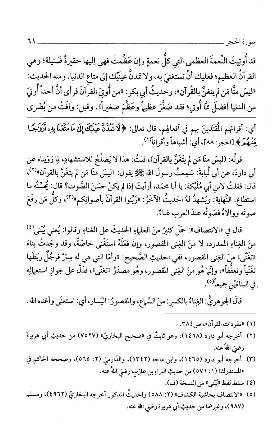 قوله: (ليس منا من لم يتغن بالقرآن)، قلت: هذا لا يصلح للاستشهاد، لما رويناه عن أبي داود، عن أبي لبابة: سمعت رسول الله صلى الله عليه وسلم يقول: "ليس منا من لم يتغن بالقرآن"، قال: فقلت لابن أبي مُليكة: يا أبا محمد، أرأيت إذا لم يكن حسن الصوت؟ قال: يحسنه ما استطاع. النهاية: ويشهد له الحديث الآخر: "زينوا القرآن بأصواتكم"، وكل من رفع صوته ووالاه فصوته عند العرب غناء.