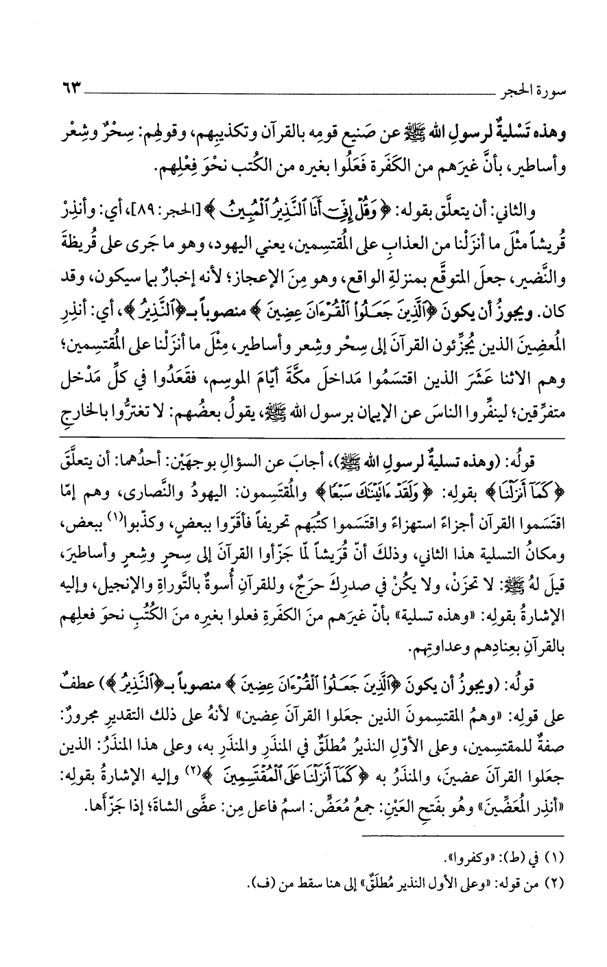قوله: (ويجوز أن يكون (الَّذِينَ جَعَلُوا الْقُرْآنَ عِضِينَ) منصوباً بـ (النَّذِيرُ) عطفٌ على قوله "وهم المقتسمون الذين جعلوا القرآن عضين" لأنه على ذلك التقدير مجرور: صفة للمقتسمين، وعلى الأول النذير مطلق في المنذر والمنذر به، وعلى هذا المنذر: الذين جعلوا القرآن عضين، والمنذر به (كَمَا أَنْزَلْنَا عَلَى الْمُقْتَسِمِينَ) وإليه الإشارة بقوله: "أنذر المعضين" وهو بفتح العين: جمع معض: اسم فاعل من: عضى الشاة؛ إذا جزأها.