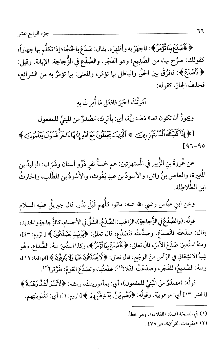 (فَاصْدَعْ بِما تُؤْمَرُ) فاجهر به وأظهره. يقال: صدع بالحجة إذا تكلم بها جهاراً، كقولك: صرح بها، من الصديع وهو الفجر، والصدع في الزجاجة: الإبانة. وقيل: (فَاصْدَعْ) فافرق بين الحق والباطل بما تؤمر، والمعنى: بما تؤمر به من الشرائع فحذف الجارّ، كقوله: