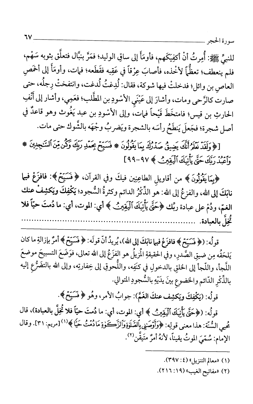 [(وَلَقَدْ نَعْلَمُ أَنَّكَ يَضِيقُ صَدْرُكَ بِما يَقُولُونَ* فَسَبِّحْ بِحَمْدِ رَبِّكَ وَكُنْ مِنَ السَّاجِدِينَ* وَاعْبُدْ رَبَّكَ حَتَّى يَاتِيَكَ الْيَقِينُ)].