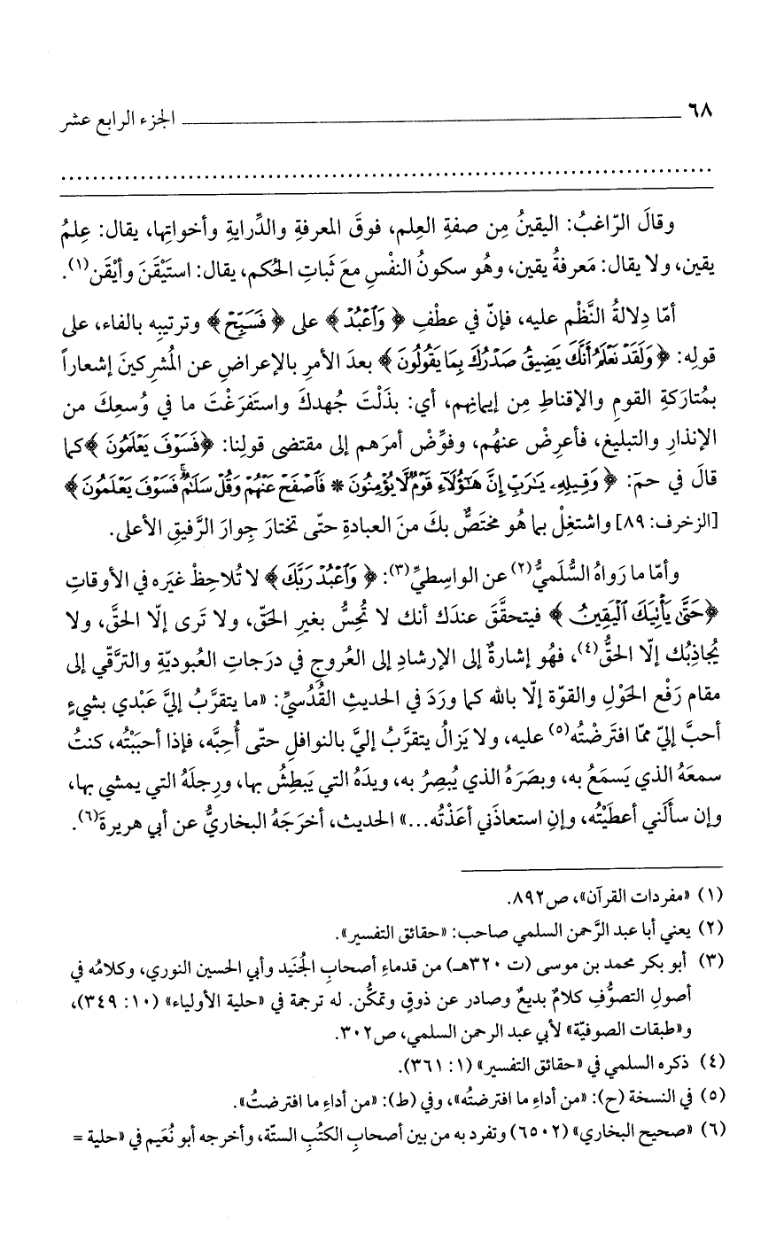 وأما ما رواه السُّلمي عن الواسطي: (وَاعْبُدْ رَبَّكَ) لا تُلاحظ غيره في الأوقات (حَتَّى يَاتِيَكَ الْيَقِينُ) فيتحقق عندك أنك لا تُحس بغير الحق، ولا ترى إلا الحق، ولا يجاذبك إلا الحق، فهو إشارة إلى الإرشاد إلى العروج في درجات العبودية والترقي إلى مقام رفع الحول والقوة إلا بالله كما ورد في الحديث القدسي: "ما يتقرب إلي عبدي بشيء أحب إلي مما افترضته عليه، ولا يزال يتقرب إلي بالنوافل حتى أحبه، فإذا أحببته، كنت سمعه الذي يسمع به، وبصره الذي يبصر به، ويده التي يبطش بها، ورجله التي يمشي بها، وإن سألني أعطيته، وإن استعاذني أعذته ... " الحديث، أخرجه البخاري عن أبي هريرة.