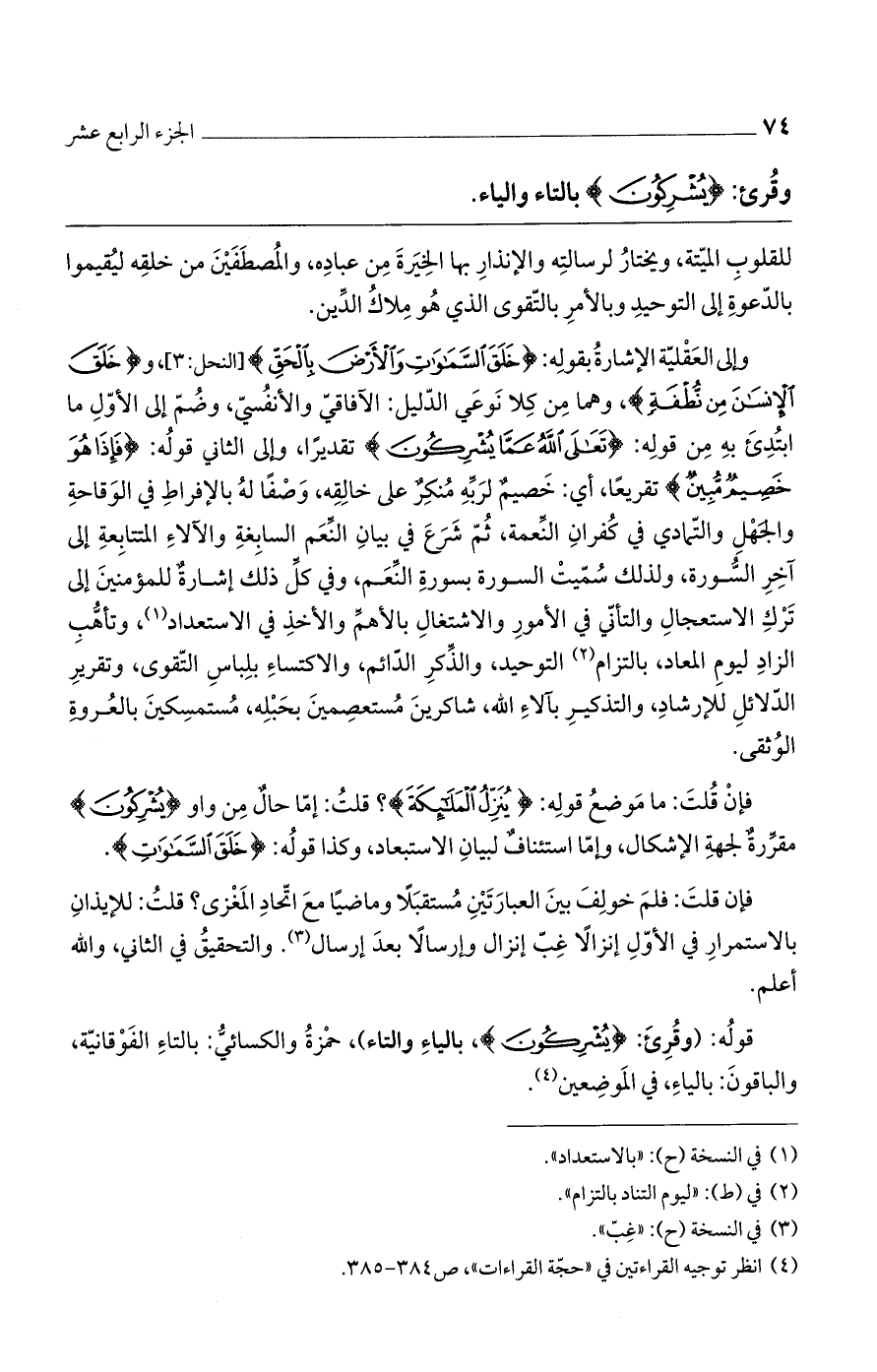 قوله: (وقرئ: (يُشْرِكُونَ)، بالياء والتاء)، حمزة والكسائي: بالتاء الفوقانية، والباقون: بالياء، في الموضعين.
