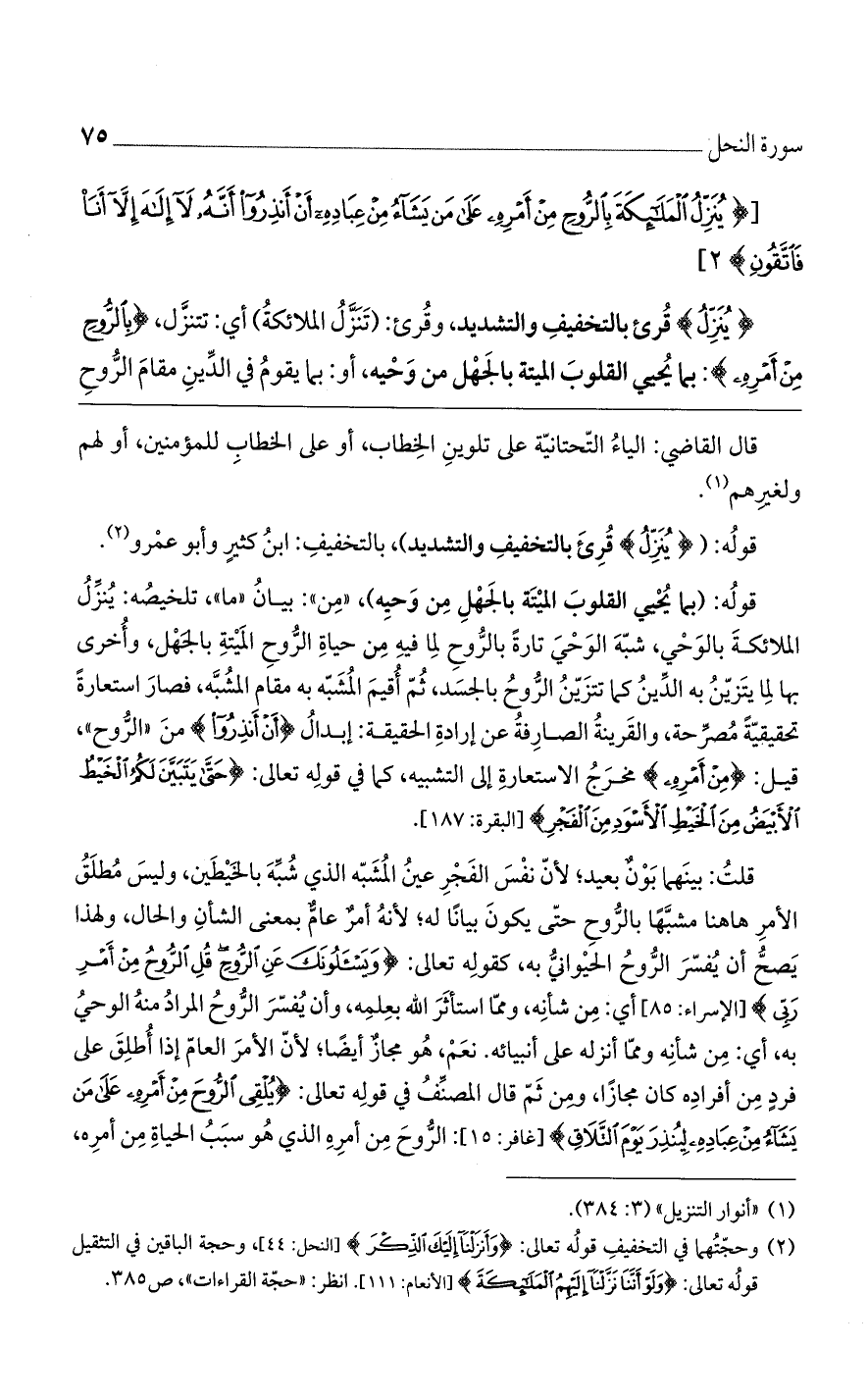 (يُنَزِّلُ) قرئ بالتخفيف والتشديد. وقرئ (تَنَزَّلُ الْمَلائِكَةُ) أي تنزل (بِالرُّوحِ مِنْ أَمْرِه) ِ بما يحيى القلوب الميتة بالجهل من وحيه، أو بما يقوم في الدين مقام الروح