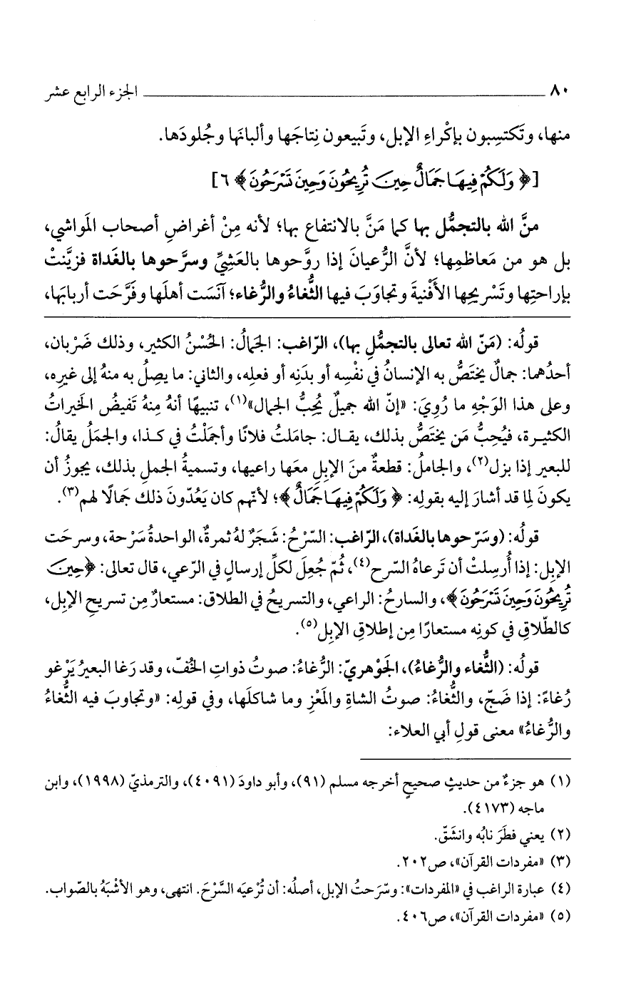 منّ الله بالتجمل بها كما منّ بالانتفاع بها، لأنه من أغراض أصحاب المواشي، بل هو من معاظمها، لأنّ الرعيان إذا روّحوها بالعشي وسرحوها بالغداة - فزينت بإراحتها وتسريحها الأفنية وتجاوب فيها الثغاء والرغاء - أنست أهلها وفرحت أربابها،