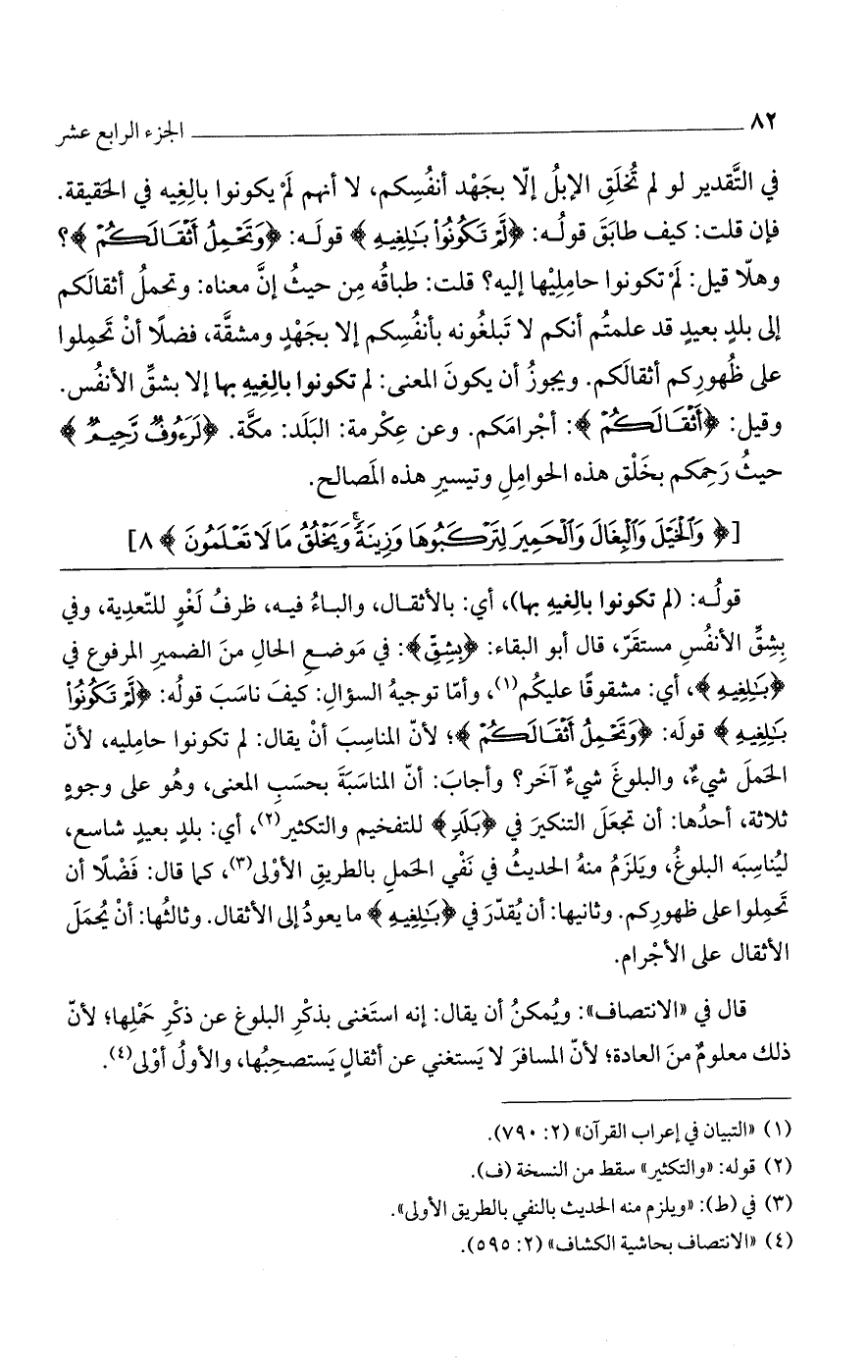 قوله: (لم تكونوا بالغيه بها)، أي: بالأثقال، والباء فيه، ظرف لغوٍ للتعدية، وفي بشق الأنفس مستقر، قال أبو البقاء: (بِشِقِّ): في موضع الحال من الضمير المرفوع في (بَالِغِيهِ)، أي: مشقوقاً عليكم، وأما توجيه السؤال: كيف ناسب قوله: (لَمْ تَكُونُوا بَالِغِيهِ) قوله: (وَتَحْمِلُ أَثْقَالَكُمْ)؛ لأن المناسب أن يقال: لم تكونوا حامليه، لأن الحمل شيء، والبلوغ شيء آخر؟ وأجاب: أن المناسبة بحسب المعنى، وهو على وجوه ثلاثة، أحدها: أن تجعل التنكير في (بَلَدٍ) للتفخيم والتكثير، أي: بلدٍ بعيدٍ شاسع، ليناسبه البلوغ، ويلزم منه الحديث في نفي الحمل بالطريق الأولى، كما قال: فضلاً أن تحملوا على ظهوركم. وثانيها: أن يُقدر في (بَالِغِيهِ) ما يعود إلى الأثقال. وثالثها: أن يُحمل الأثقال على الأجرام.