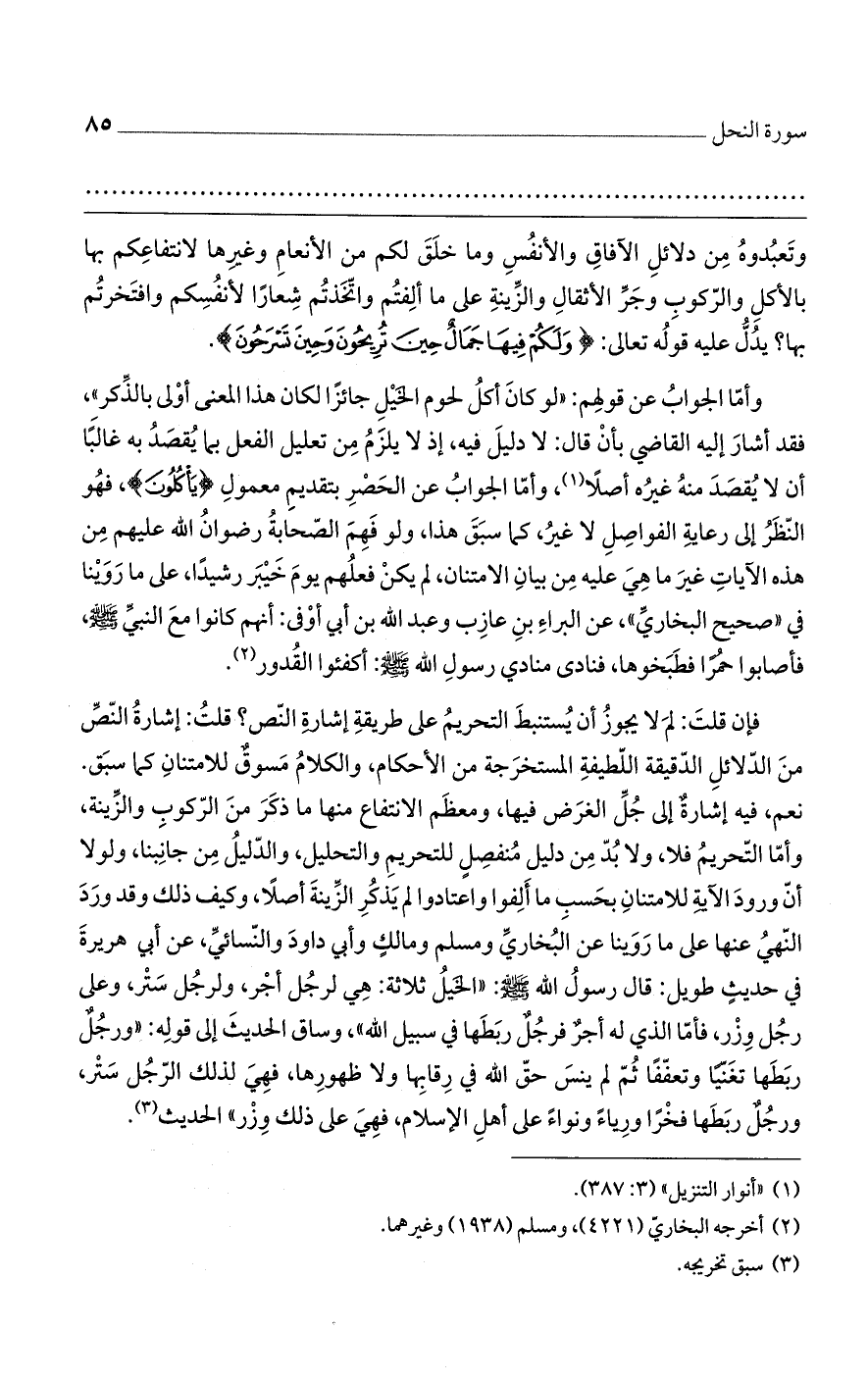 فإن قلت: لم لا يجوز أن يستنبط التحريم على طريقة إشارة النص؟ قلت: إشارة النص من الدلائل الدقيقة اللطفة المستخرجة من الأحكام، والكلام مسوق للامتنان كما سبق. نعم، فيه إشارة إلى جُل الغرض فيها، ومعظم الانتفاع منها ما ذكر من الركوب والزينة، وأما التحريم فلا، ولابد من دليل منفصل للتحريم والتحليل، والدليل من جانبنا، ولولا أن ورود الآية للامتنان بحسب ما ألفوا واعتادوا لم يذكر الزينة أصلاً، وكيف ذلك وقد ورد النهي عنها على ما روينا عن البخاري ومسلم ومالك وأبي داود والنسائي، عن أبي هريرة في حديث طويل: قال رسول الله صلى الله عليه وسلم: "الخيل ثلاثة: هي لرجل أجرن ولرجل ستر، وعلى رجل وزر، فأما الذي له أجر فرجل ربطها في سبيل الله"، وساق الحديث إلى قوله: "ورجل ربطها تغنياً وتعففاً ثم لم ينس حق الله في رقابها ولا ظهورها، فهي لذلك الرجل ستر، ورجل ربطها فخراً ورياء ونواء على أهل الإسلام، فهي على ذلك وزر" الحديث.