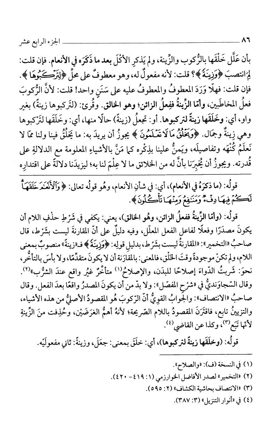 قوله: (وأما الزينة ففعل الزائن، وهو الخالق)، يعني: يكفي في شرط حذف اللام أن يكون مصدراً وفعلاً لفاعل الفعل المعلل، وفيه دليل على أن المقارنة ليست بشرط، قال صاحب "التخمير": "المقارنة ليست بشرط، بدليل قوله: (وَزِينَةٌ) فـ"زينة" منصوب بمعنى اللام، ولم تكن موجودة وقت الخلق، فالمعنى: بالمقارنة أن لا يكون متقدماً، ولا بأس بالتأخر، نحو: شربت الدواء إصلاحاً للبدن، والإصلاح متأخر غير واقع عند الشرب". وقال السجاوندي في "شرح المفصل": ولابد من أن يكون المصدر واقعاً بعد الفعل. وقال صاحب "الانتصاف": والجواب القوي أن الركوب هو المقصود الأصلي من هذه الأشياء، والتزيين تابع، فاقترن المقصود باللام الصريحة؛ لأنه أهم الغرضين، وحُذفت من الزينة لأنها تبع، وكذا عن القاضي.
