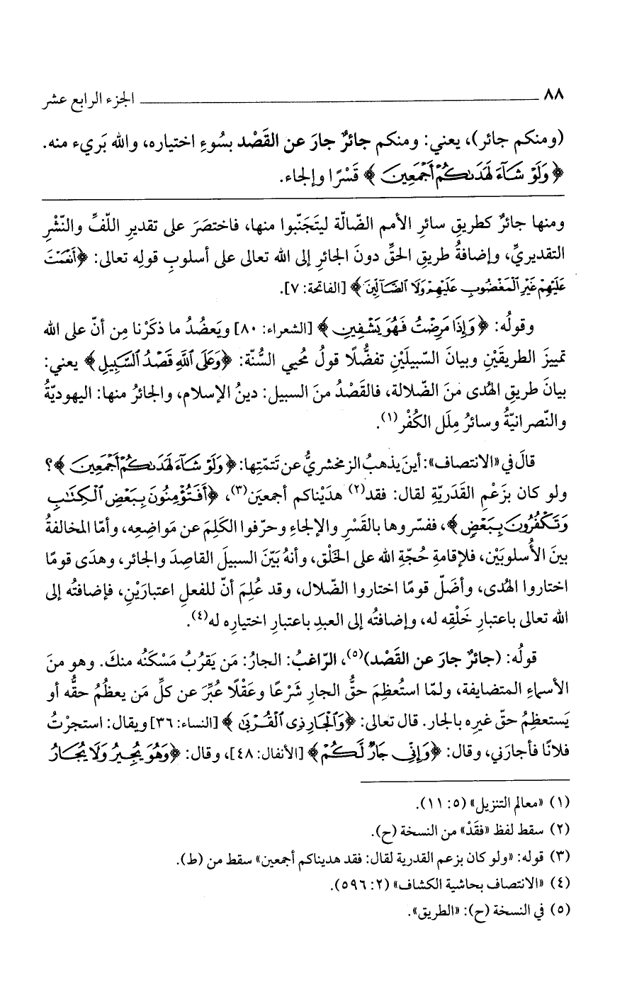 ومنها جائرٌ كطريق سائر الأمم الضالة ليتجنبوا منها، فاختصر على تقدير اللف والنشر التقديري، وإضافة طريق الحق دون الجائر إلى الله تعالى على أسلوب قوله تعالى: (أَنْعَمْتَ عَلَيْهِمْ غَيْرِ الْمَغْضُوبِ عَلَيْهِمْ وَلا الضَّالِّينَ) [الفاتحة: 7].