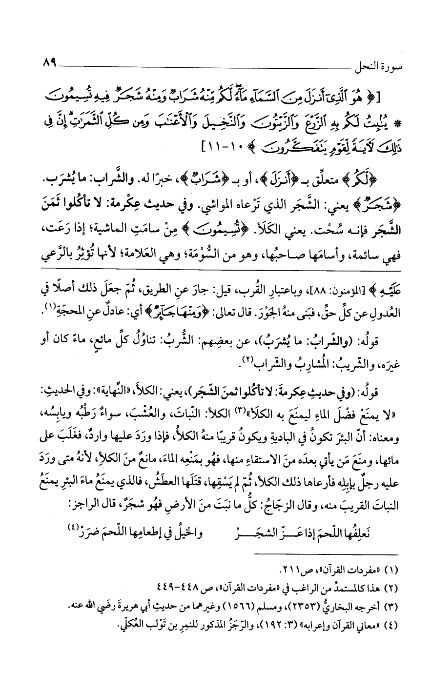 (لَكُمْ) متعلق (بأنزل)، أو ب (شراب)، خبراً له. والشراب ما يشرب (شَجَرٌ) يعنى الشجر الذي ترعاه المواشي. وفي حديث عكرمة: لا تأكلوا ثمن الشجر فإنه سحت. يعنى الكلأ (تُسِيمُونَ) من سامت الماشية إذا رعت، فهي سائمة، وأسامها صاحبها، وهو من السومة وهي العلامة، لأنها تؤثر بالرعي