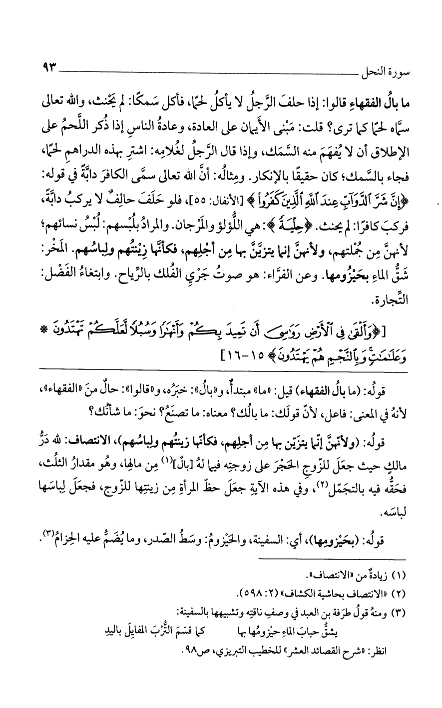 ما بال الفقهاء قالوا: إذا حلف الرجل لا يأكل لحماً، فأكل سمكاً، لم يخنث. والله تعالى سماه لحماً كما ترى؟ قلت: مبنى الإيمان على العادة، وعادة الناس إذا ذكر اللحم على الإطلاق أن لا يفهم منه السمك، وإذا قال الرجل لغلامه: اشتر بهذه الدراهم لحماً فجاء بالسمك، كان حقيقاً بالإنكار. ومثاله أن الله تعالى سمى الكافر دابة في قوله: (إنَّ شَرَّ الدَّوَابِّ عِندَ اللَّهِ الَّذِينَ كَفَرُوا)] الأنفال: 55 [، فلو حلف حالف لا يركب دابة فركب كافراً لم يحنث. (حِلْيَةً) هي اللؤلؤ والمرجان». والمراد بلبسهم: لبس نسائهم، لأنهنّ من جملتهم، ولأنهنّ إنما يتزينّ بها من أجلهم، فكأنها زينتهم ولباسهم. المخر: شق الماء بحيزومها. وعن الفراء: هو صوت جرى الفلك بالرياح. وابتغاء الفضل: التجارة.