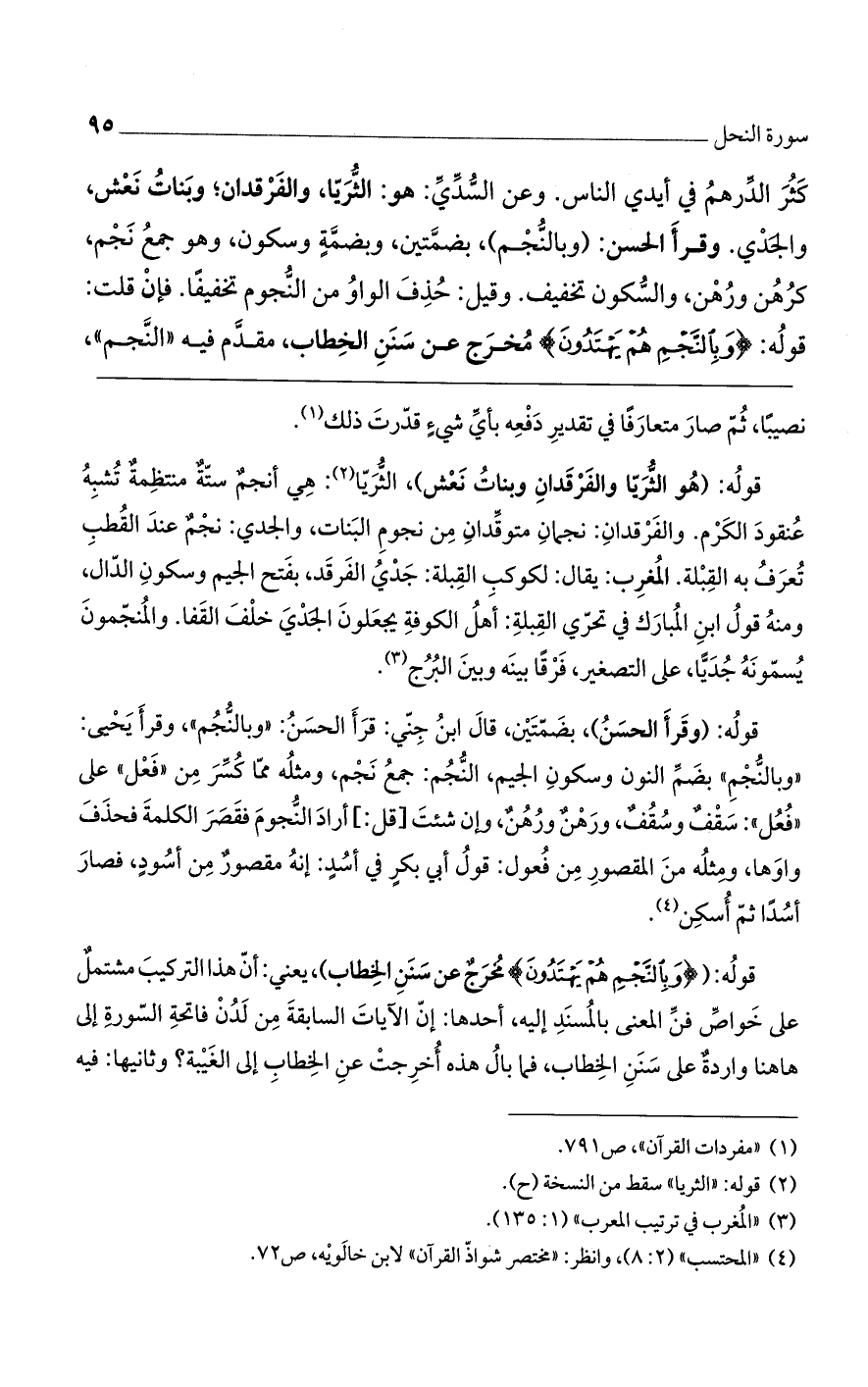 قوله: (وقرأ الحسن)، بضمتين، قال ابن جني: قرأ الحسن: "وبالنُّجُم"، وقرأ يحيى: "وبالنُّجْم" بضم النون وسكون الجيم، النجم: جمع نجم، ومثله مما كسر من "فعل" على "فُعُل": سقف وسُقفٌ، ورهنٌ ورُهُنٌ، وإن شئت [قل: ] أراد النجوم فقصر الكلمة فحذف واوها، ومثله من المقصور من فعول: قول أبي بكر في أسُدٍ: إنه مقصور من أسودٍ، فصار أسُداً ثم أُسكن.