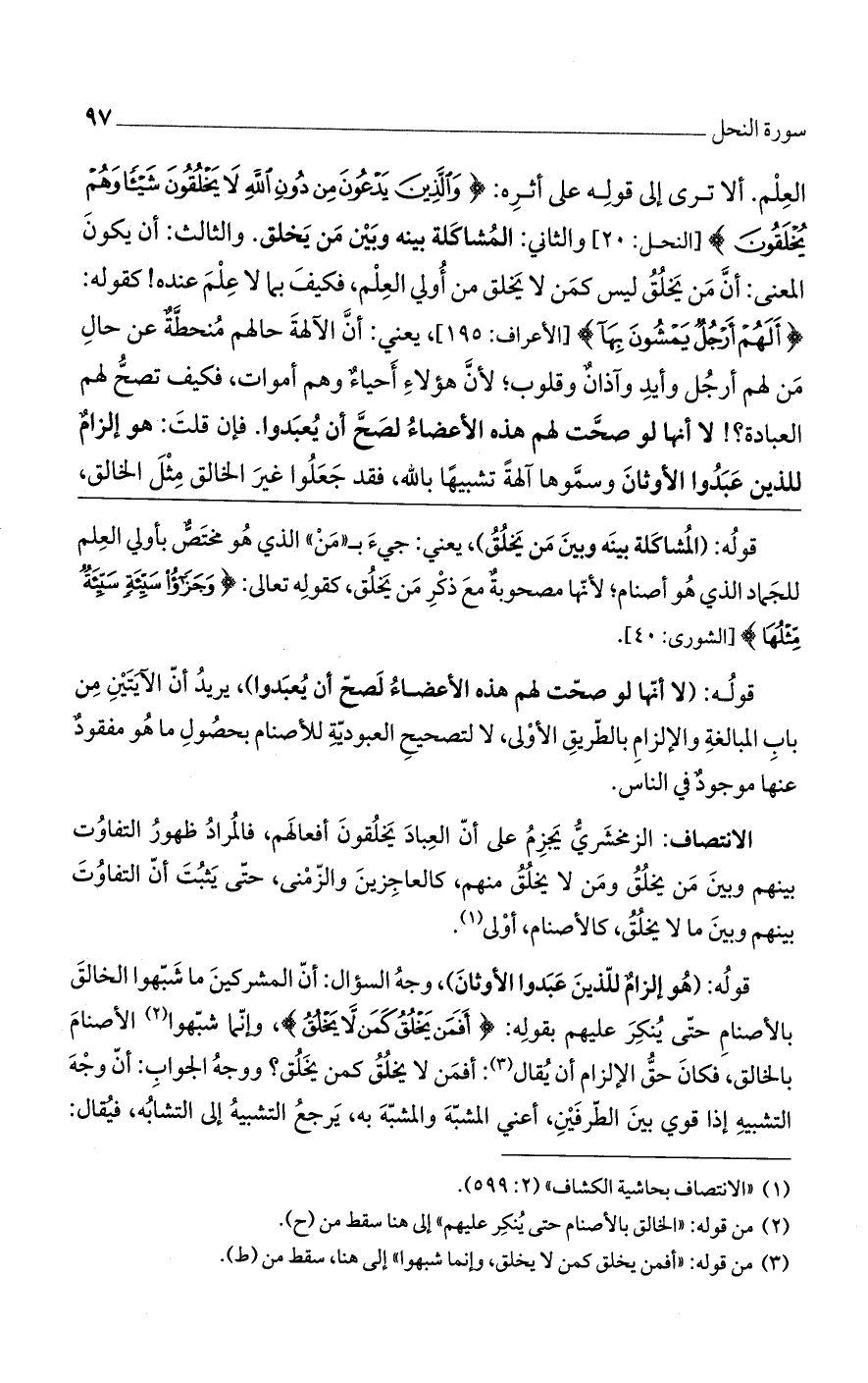 قوله: (هو إلزام للين عبدوا الأوثان)، وجهُ السؤال: أن المشركين ما شبهوا الخالق بالأصنام حتى ينكر عليهم بقوله: (أَفَمَنْ يَخْلُقُ كَمَنْ لا يَخْلُقُ)، وإنما شبهوا الأصنام بالخالق، فكان حق الإلزام أن يُقال: أفمن لا يخلق كمن يخلق؟ ووجه الجواب: أن وجه التشبيه إذا قوي بين الطرفين، أعني المشبه والمشبه به، يرجع التشبيه إلى التشابه، فيُقال: