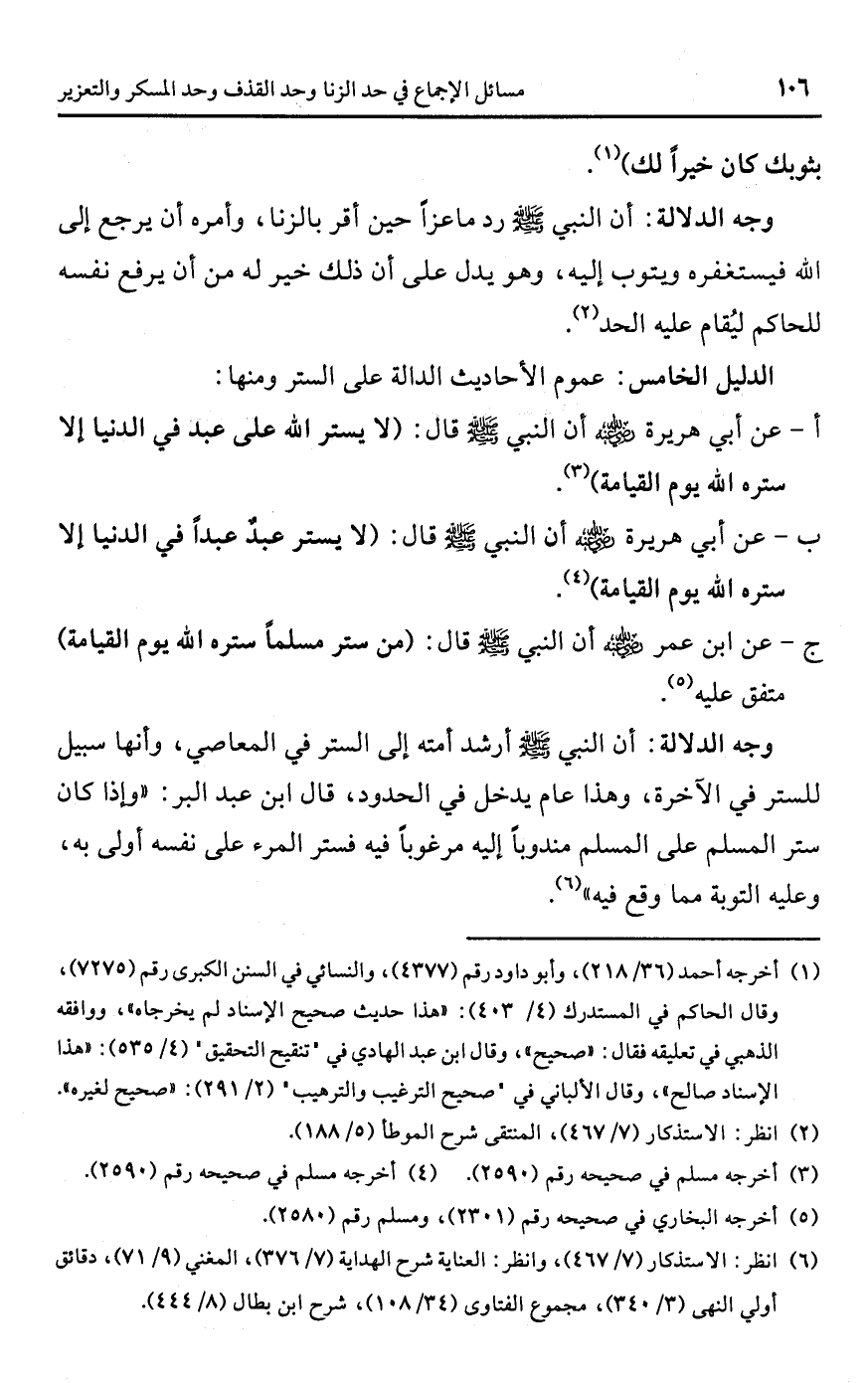 • وجه الدلالة: أن النبي -صلى اللَّه عليه وسلم- أرشد أمته إلى الستر في المعاصي، وأنها سبيل للستر في الآخرة، وهذا عام يدخل في الحدود، قال ابن عبد البر: "وإذا كان ستر المسلم على المسلم مندوبًا إليه مرغوبًا فيه فستر المرء على نفسه أولى به، وعليه التوبة مما وقع فيه" (¬6).