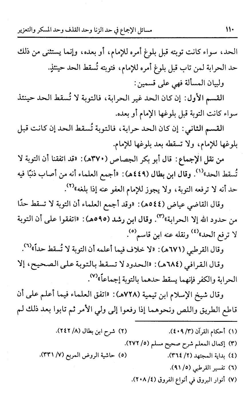 • من نقل الإجماع: قال أبو بكر الجصاص (370 هـ): "قد اتفقنا أن التوبة لا تُسقط الحد" (¬1). وقال ابن بطال (449 هـ): "أجمع العلماء أنه من أصاب ذنبًا فيه حد أنه لا ترفعه التوبة، ولا يجوز للإمام العفو عنه إذا بلغه" (¬2).