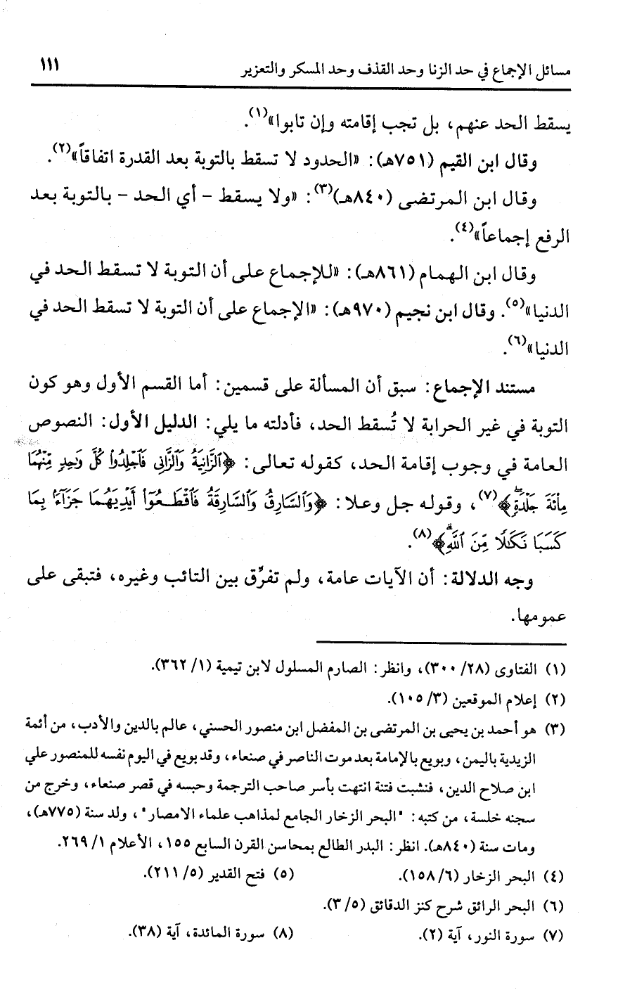 وقال ابن المرتضى (840 هـ) (¬3): "ولا يسقط -أي الحد- بالتوبة بعد الرفع إجماعًا" (¬4).