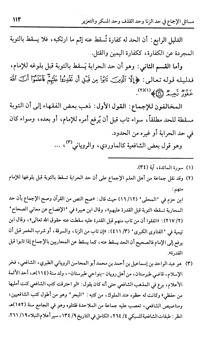 ابن حزم في "المحلى" (12/ 16) حيث قال: "صح النص من القرآن وصح الإجماع بأن حد المحاربة تسقطه التوبة قبل القدرة عليهم"، وقال ابن هبيرة في "الإفصاح عن معاني الصحاح" (2/ 217): "اتفقوا أن من تاب منهم قبل القدرة عليه سقطت عنه حقوق اللَّه تعالى"، وقال ابن تيمية في "الفتاوى الكبرى" (3/ 411): "إن تاب من الزنا، والسرقة، أو شرب الخمر قبل أن يرفع إلى الإمام فالصحيح أن الحد يسقط عنه، كما يسقط عن المحاربين بالإجماع إذا تابوا قبل القدرة".