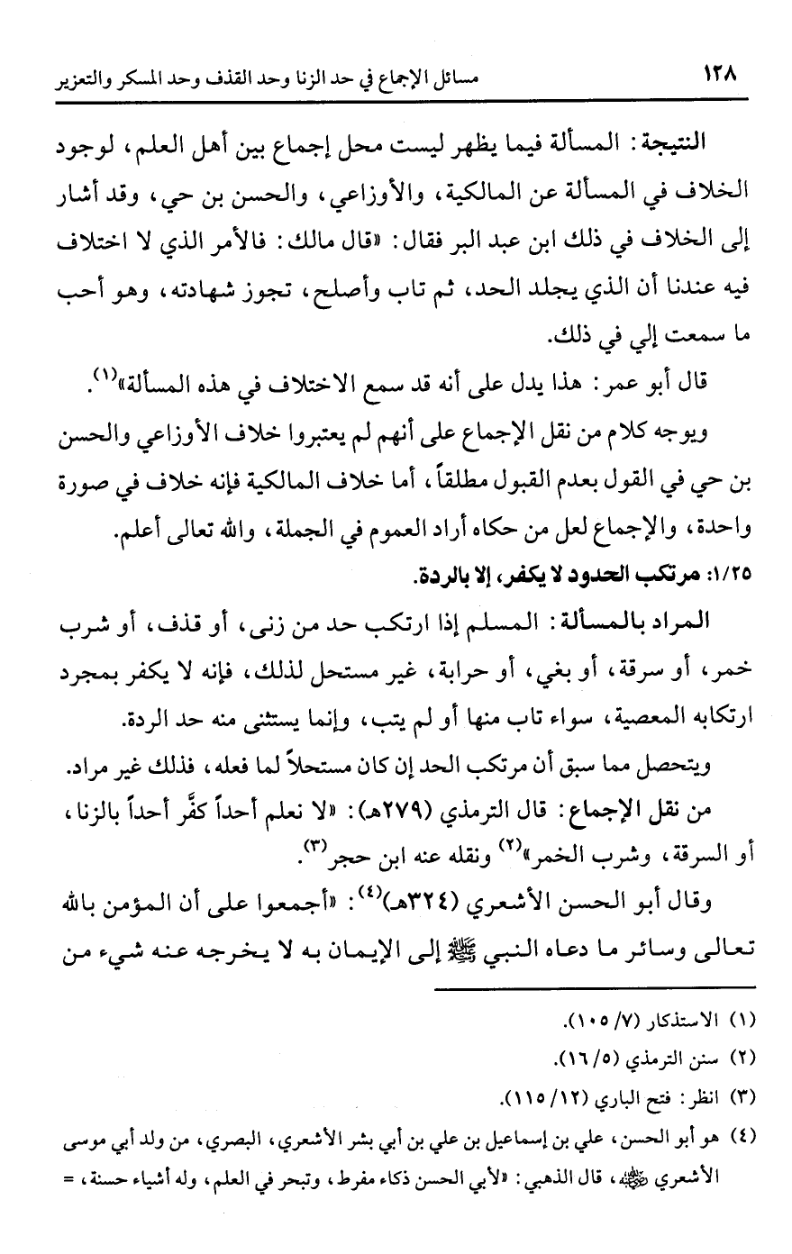 • من نقل الإجماع: قال الترمذي (279 هـ): "لا نعلم أحدًا كفَّر أحدًا بالزنا، أو السرقة، وشرب الخمر" (¬2) ونقله عنه ابن حجر (¬3).