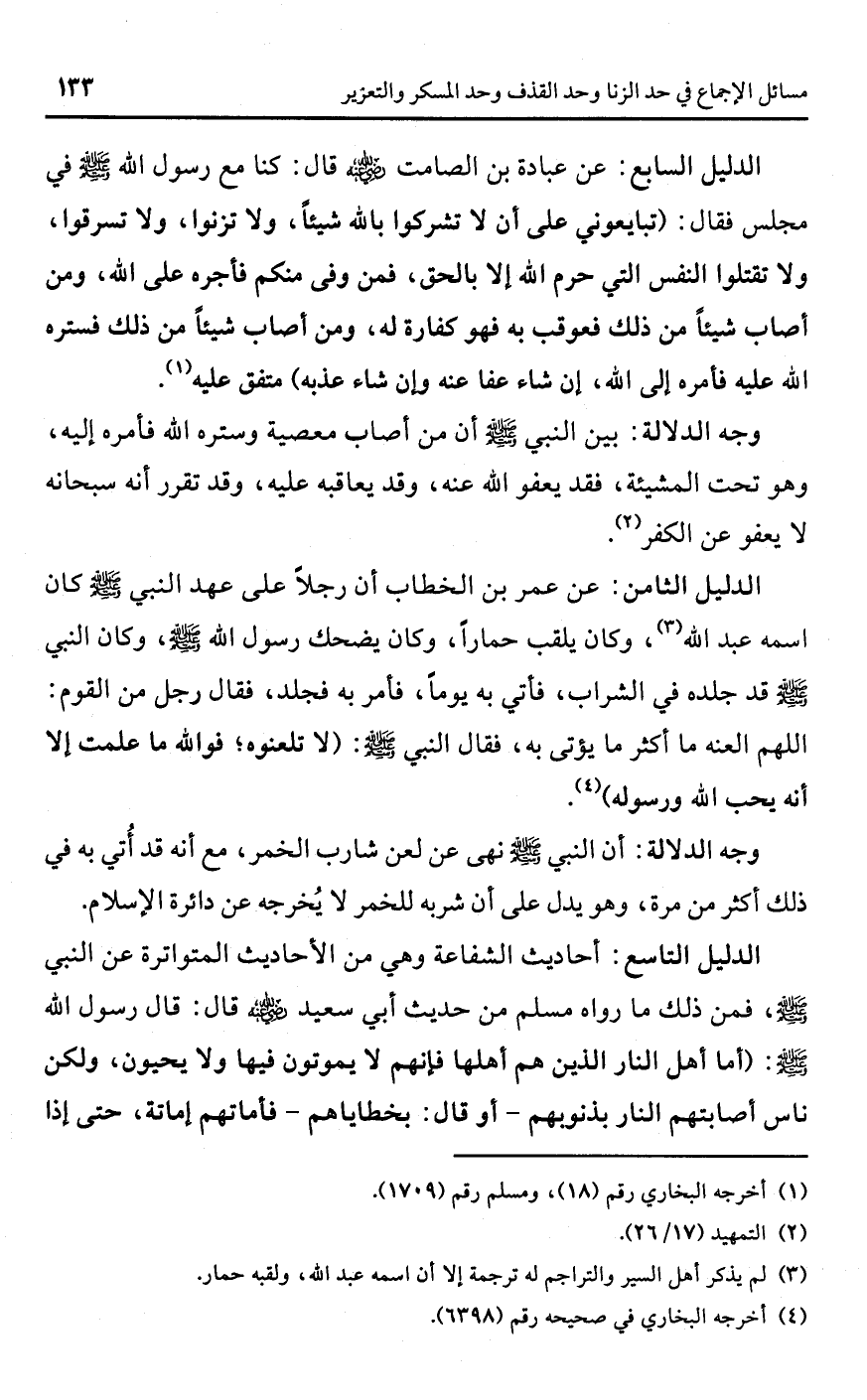 الدليل السابع: عن عبادة بن الصامت -رضي اللَّه عنه- قال: كنا مع رسول اللَّه -صلى اللَّه عليه وسلم- في مجلس فقال: (تبايعوني على أن لا تشركوا باللَّه شيئًا، ولا تزنوا، ولا تسرقوا، ولا تقتلوا النفس التي حرم اللَّه إلا بالحق، فمن وفى منكم فأجره على اللَّه، ومن أصاب شيئًا من ذلك فعوقب به فهو كفارة له، ومن أصاب شيئًا من ذلك فستره اللَّه عليه فأمره إلى اللَّه، إن شاء عفا عنه وإن شاء عذبه) متفق عليه (¬1).
