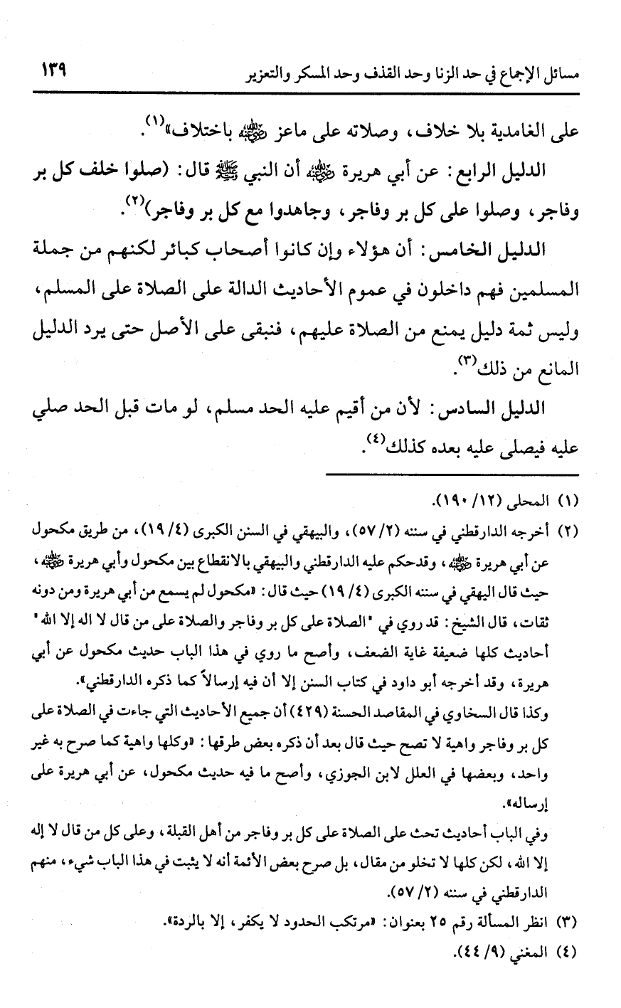 الدليل الرابع: عن أبي هريرة -رضي اللَّه عنه- أن النبي -صلى اللَّه عليه وسلم- قال: (صلوا خلف كل بر وفاجر، وصلوا على كل بر وفاجر، وجاهدوا مع كل بر وفاجر) (¬2).