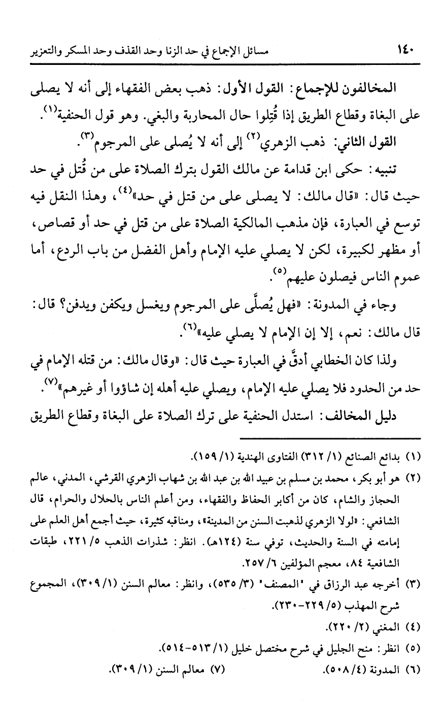 تنبيه: حكى ابن قدامة عن مالك القول بترك الصلاة على من قُتل في حد حيث قال: "قال مالك: لا يصلى على من قتل في حد" (¬4)، وهذا النقل فيه توسع في العبارة، فإن مذهب المالكية الصلاة على من قتل في حد أو قصاص، أو مظهر لكبيرة، لكن لا يصلي عليه الإمام وأهل الفضل من باب الردع، أما عموم الناس فيصلون عليهم (¬5).