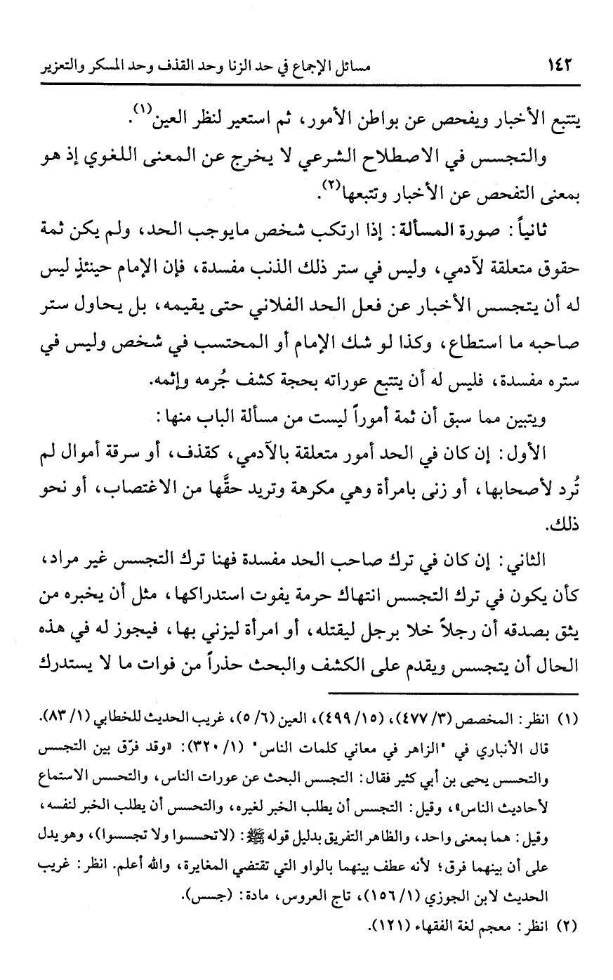 • ثانيًا: صورة المسألة: إذا ارتكب شخص ما يوجب الحد، ولم يكن ثمة حقوق متعلقة لآدمي، وليس في ستر ذلك الذنب مفسدة، فإن الإمام حينئذٍ ليس له أن يتجسس الأخبار عن فعل الحد الفلاني حتى يقيمه، بل يحاول ستر صاحبه ما استطاع، وكذا لو شك الإمام أو المحتسب في شخص وليس في ستره مفسدة، فليس له أن يتتبع عوراته بحجة كشف جُرمه وإثمه.