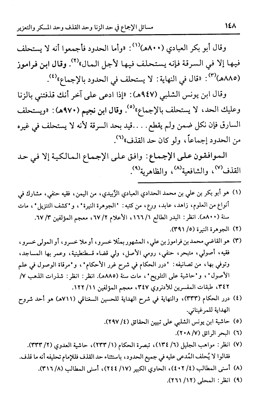 وقال أبو بكر العبادي (800 هـ) (¬1): "وأما الحدود فأجمعوا أنه لا يستحلف فيها إلا في السرقة فإنه يستحلف فيها لأجل المال" (¬2). وقال ابن فراموز (885 هـ) (¬3): "قال في النهاية: لا يستحلف في الحدود بالإجماع" (¬4).