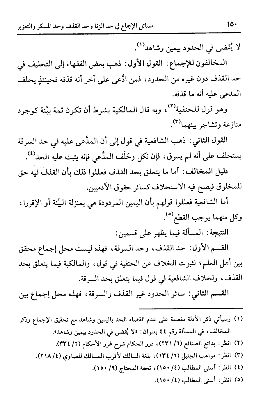 (¬1) وسيأتي ذكر الأدلة مفصلة على عدم القضاء الحد باليمين وشاهد مع تحقيق الإجماع وذكر المخالف، في المسألة رقم 44 بعنوان: "لا يُقضى في الحدود بيمين وشاهد".