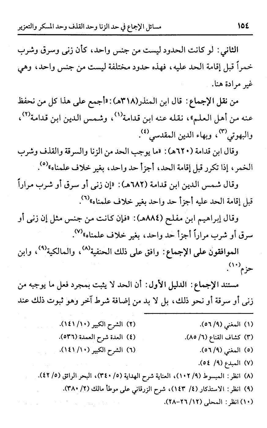 وقال ابن قدامة (620 هـ): "ما يوجب الحد من الزنا والسرقة والقذف وشرب الخمر، إذا تكرر قبل إقامة الحد، أجزأ حد واحد، بغير خلاف علمناه" (¬5).