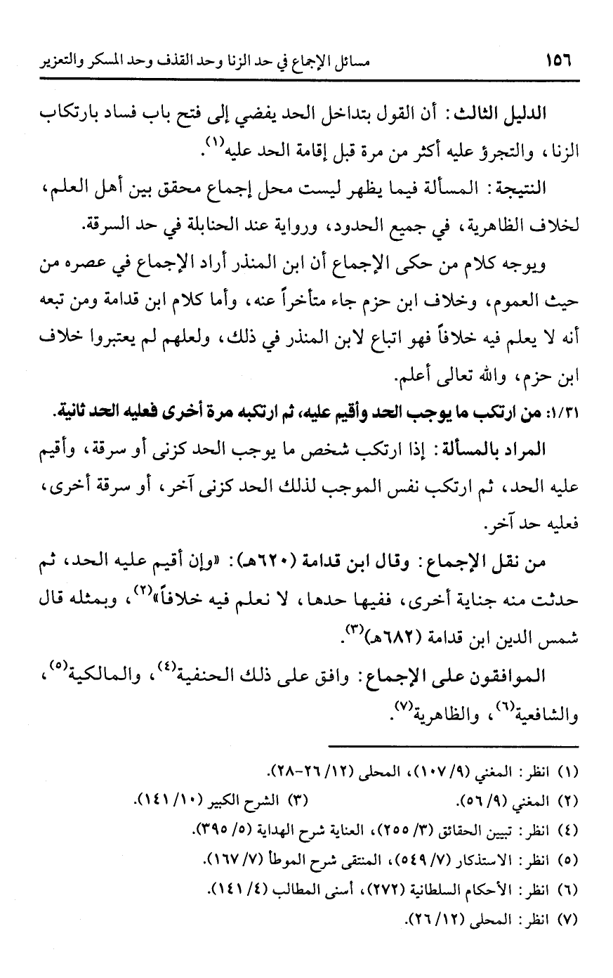 الدليل الثالث: أن القول بتداخل الحد يفضي إلى فتح باب فساد بارتكاب الزنا، والتجرؤ عليه أكثر من مرة قبل إقامة الحد عليه (¬1).Rالمسألة فيما يظهر ليست محل إجماع محقق بين أهل العلم، لخلاف الظاهرية، في جميع الحدود، ورواية عند الحنابلة في حد السرقة.