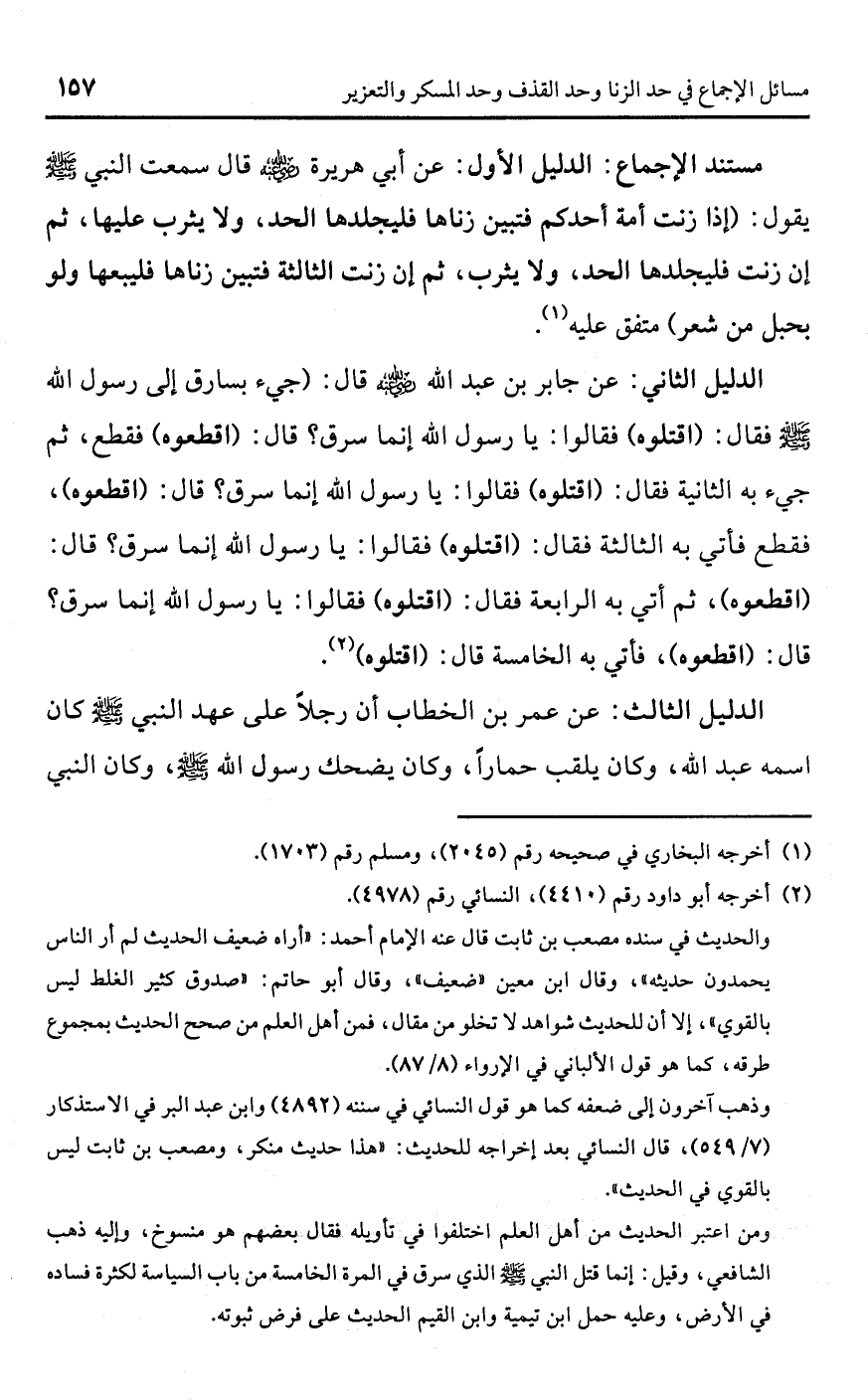 الدليل الثاني: عن جابر بن عبد اللَّه -رضي اللَّه عنه- قال: (جيء بسارق إلى رسول اللَّه -صلى اللَّه عليه وسلم- فقال: (اقتلوه) فقالوا: يا رسول اللَّه إنما سرق؟ قال: (اقطعوه) فقطع، ثم جيء به الثانية فقال: (اقتلوه) فقالوا: يا رسول اللَّه إنما سرق؟ قال: (اقطعوه)، فقطع فأتي به الثالثة فقال: (اقتلوه) فقالوا: يا رسول اللَّه إنما سرق؟ قال: (اقطعوه)، ثم أتي به الرابعة فقال: (اقتلوه) فقالوا: يا رسول اللَّه إنما سرق؟ قال: (اقطعوه)، فأتي به الخامسة قال: (اقتلوه) (¬2).