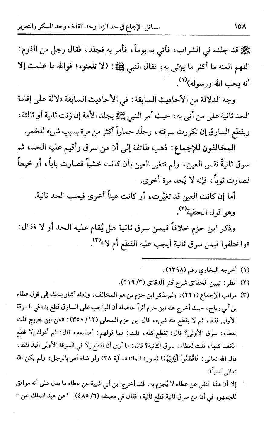 (¬3) مراتب الإجماع (221)، ولم يذكر ابن حزم من هو المخالف، ولعله أشار بذلك إلى قول عطاء بن أبي رباح، حيث أخرج عنه ابن حزم أثرًا حاصله أن الواجب على السارق قطع يده في السرقة الأولى فقط، ثم لا يقطع منه شيء، قال ابن حزم المحلى (12/ 350): "عن ابن جريج قلت لعطاء: سرَق الأولى؟ قال: تقطع كفه، قلت: فما قولهم: أصابعه، قال: لم أدرك إلا قطع الكف كلها، قلت لعطاء: سرق الثانية؟ قال: ما أرى أن تقطع إلا في السرقة الأولى اليد فقط، قال اللَّه تعالى: فَاقْطَعُوا أيْدِيَهُمَا (سورة المائدة، آية 38) ولو شاء أمر بالرجل، ولم يكن اللَّه تعالى نسيًا".