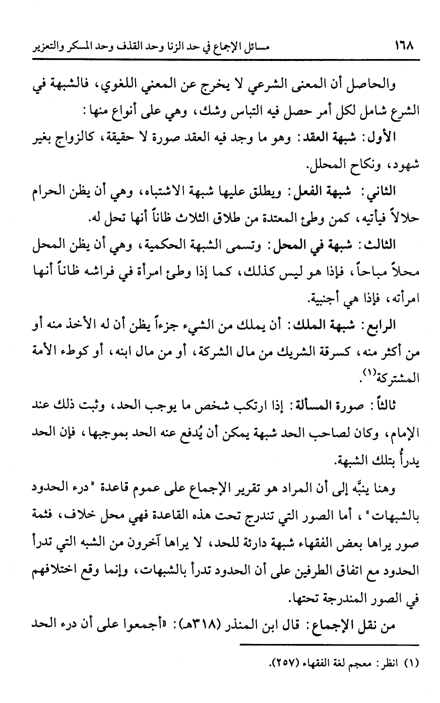 وهنا ينبَّه إلى أن المراد هو تقرير الإجماع على عموم قاعدة "درء الحدود بالشبهات"، أما الصور التي تندرج تحت هذه القاعدة فهي محل خلاف، فثمة صور يراها بعض الفقهاء شبهة دارئة للحد، لا يراها آخرون من الشبه التي تدرأ الحدود مع اتفاق الطرفين على أن الحدود تدرأ بالشبهات، وإنما وقع اختلافهم في الصور المندرجة تحتها.