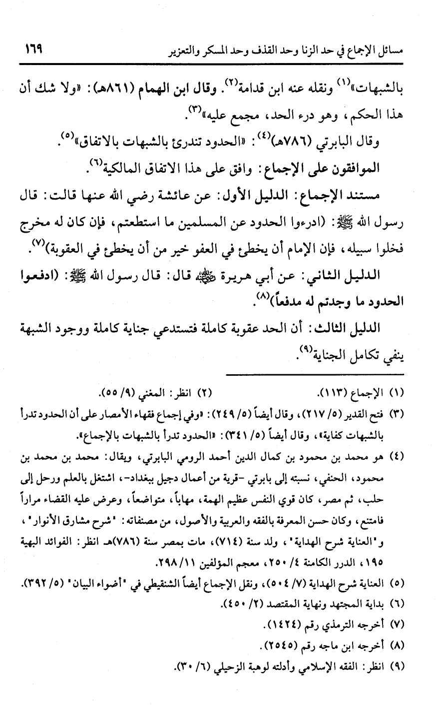 (¬3) فتح القدير (5/ 217)، وقال أيضًا (5/ 249): "وفي إجماع فقهاء الأمصار على أن الحدود تدرأ بالشبهات كفاية"، وقال أيضًا (5/ 341): "الحدود تدرأ بالشبهات بالإجماع".