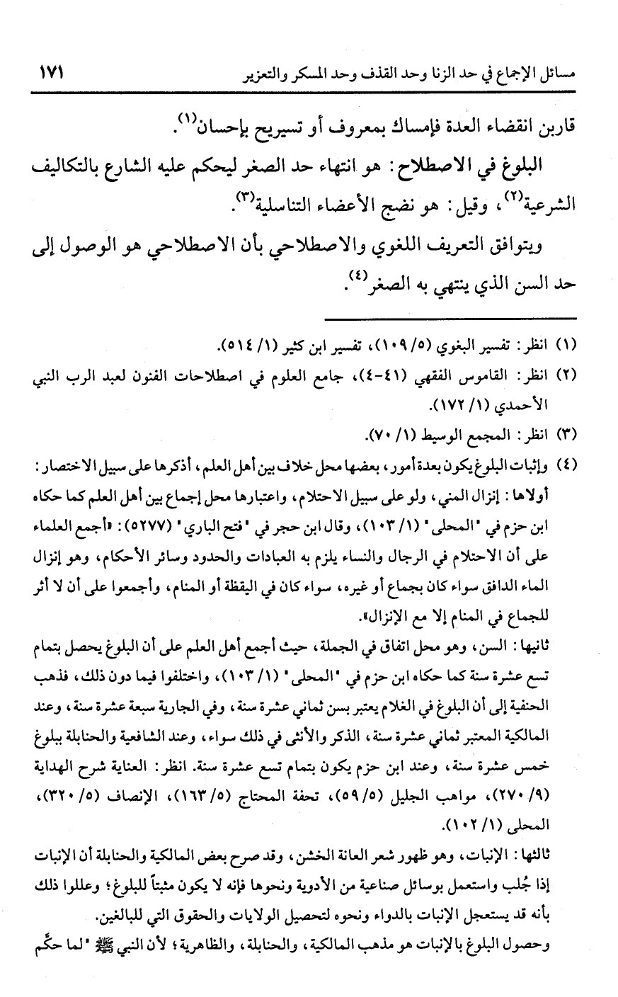 ويتوافق التعريف اللغوي والاصطلاحي بأن الاصطلاحي هو الوصول إلى حد السن الذي ينتهي به الصغر (¬4).