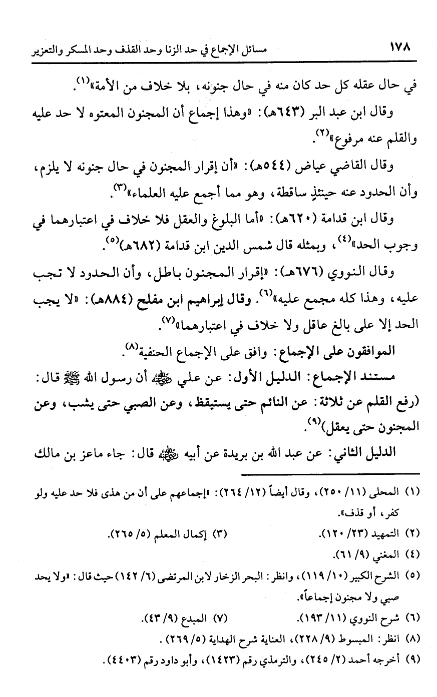 وقال النووي (676 هـ): "إقرار المجنون باطل، وأن الحدود لا تجب عليه، وهذا كله مجمع عليه" (¬6). وقال إبراهيم ابن مفلح (884 هـ): "لا يجب الحد إلا على بالغ عاقل ولا خلاف في اعتبارهما" (¬7).