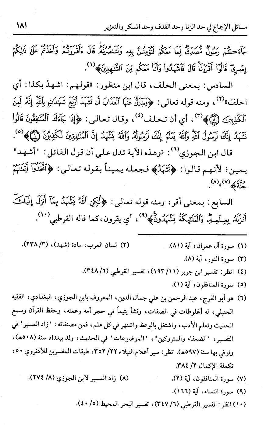 قال ابن الجوزي (¬6): "وهذه الآية تدل على أن قول القائل: "أشهد" يمين؛ لأنهم قالوا: {نَشْهَدُ} فجعله يمينًا بقوله تعالى: {اتَّخَذُوا أَيْمَانَهُمْ جُنَّةً} (¬7) " (¬8).