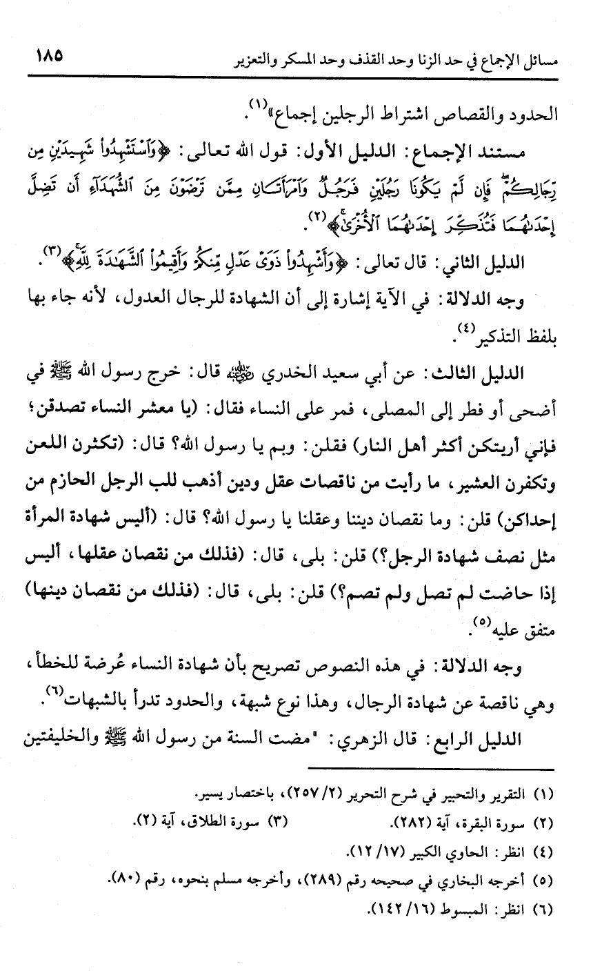 • وجه الدلالة: في هذه النصوص تصريح بأن شهادة النساء عُرضة للخطأ، وهي ناقصة عن شهادة الرجال، وهذا نوع شبهة، والحدود تدرأ بالشبهات (¬6).