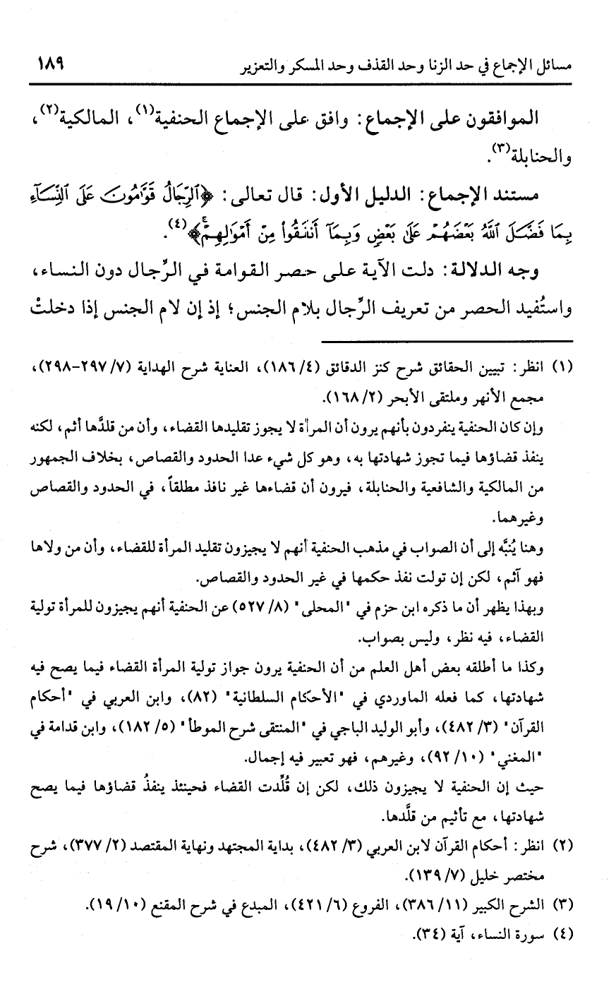 • مستند الإجماع: الدليل الأول: قال تعالى: {الرِّجَالُ قَوَّامُونَ عَلَى النِّسَاءِ بِمَا فَضَّلَ اللَّهُ بَعْضَهُمْ عَلَى بَعْضٍ وَبِمَا أَنْفَقُوا مِنْ أَمْوَالِهِمْ} (¬4).