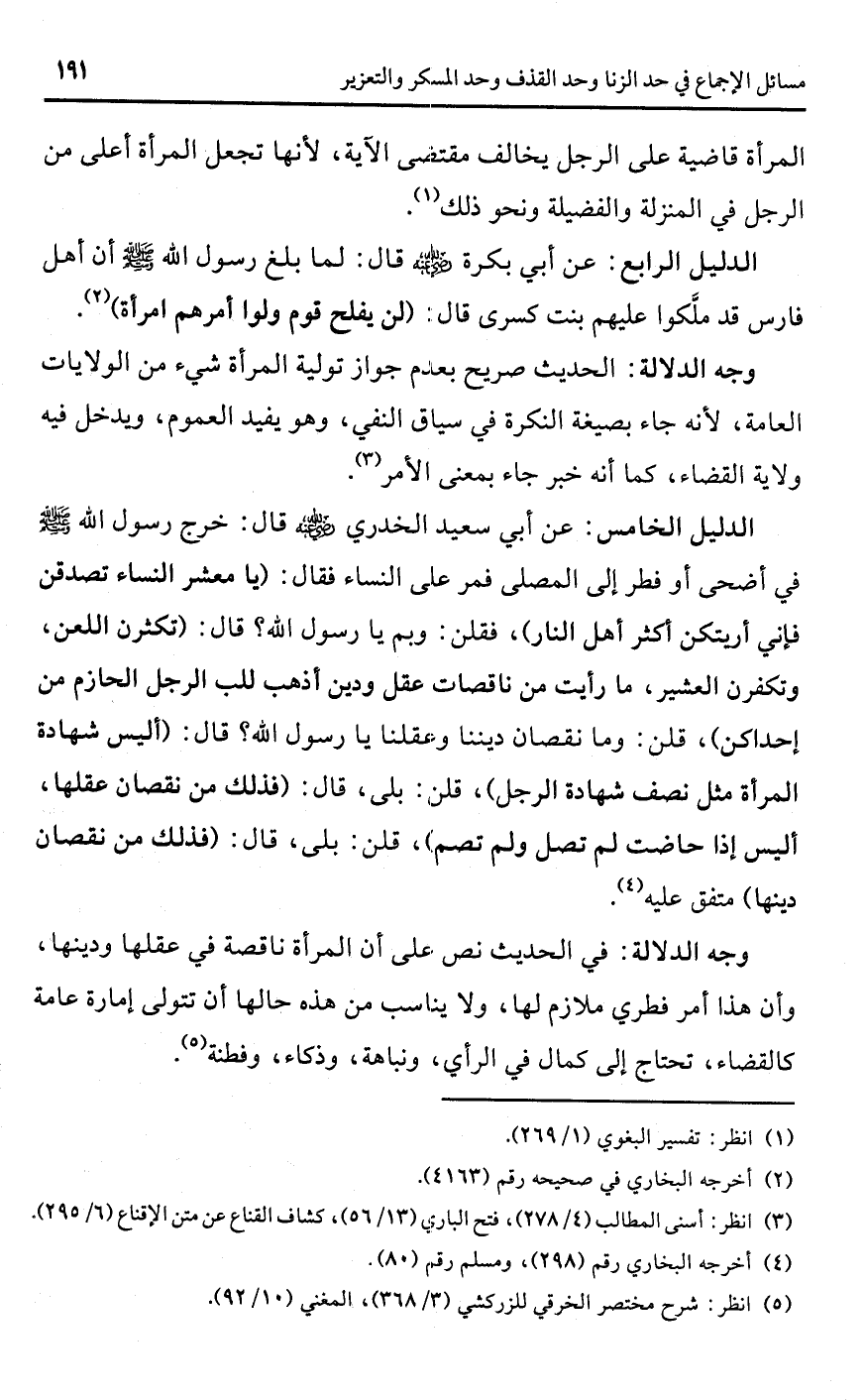الدليل الخامس: عن أبي سعيد الخدري -رضي اللَّه عنه- قال: خرج رسول اللَّه -صلى اللَّه عليه وسلم- في أضحى أو فطر إلى المصلى فمر على النساء فقال: (يا معشر النساء تصدقن فإني أريتكن أكثر أهل النار)، فقلن: وبم يا رسول اللَّه؟ قال: (تكثرن اللعن، وتكفرن العشير، ما رأيت من ناقصات عقل ودين أذهب للب الرجل الحازم من إحداكن)، قلن: وما نقصان ديننا وعقلنا يا رسول اللَّه؟ قال: (أليس شهادة المرأة مثل نصف شهادة الرجل)، قلن: بلى، قال: (فذلك من نقصان عقلها، أليس إذا حاضت لم تصل ولم تصم)، قلن: بلى، قال: (فذلك من نقصان دينها) متفق عليه (¬4).