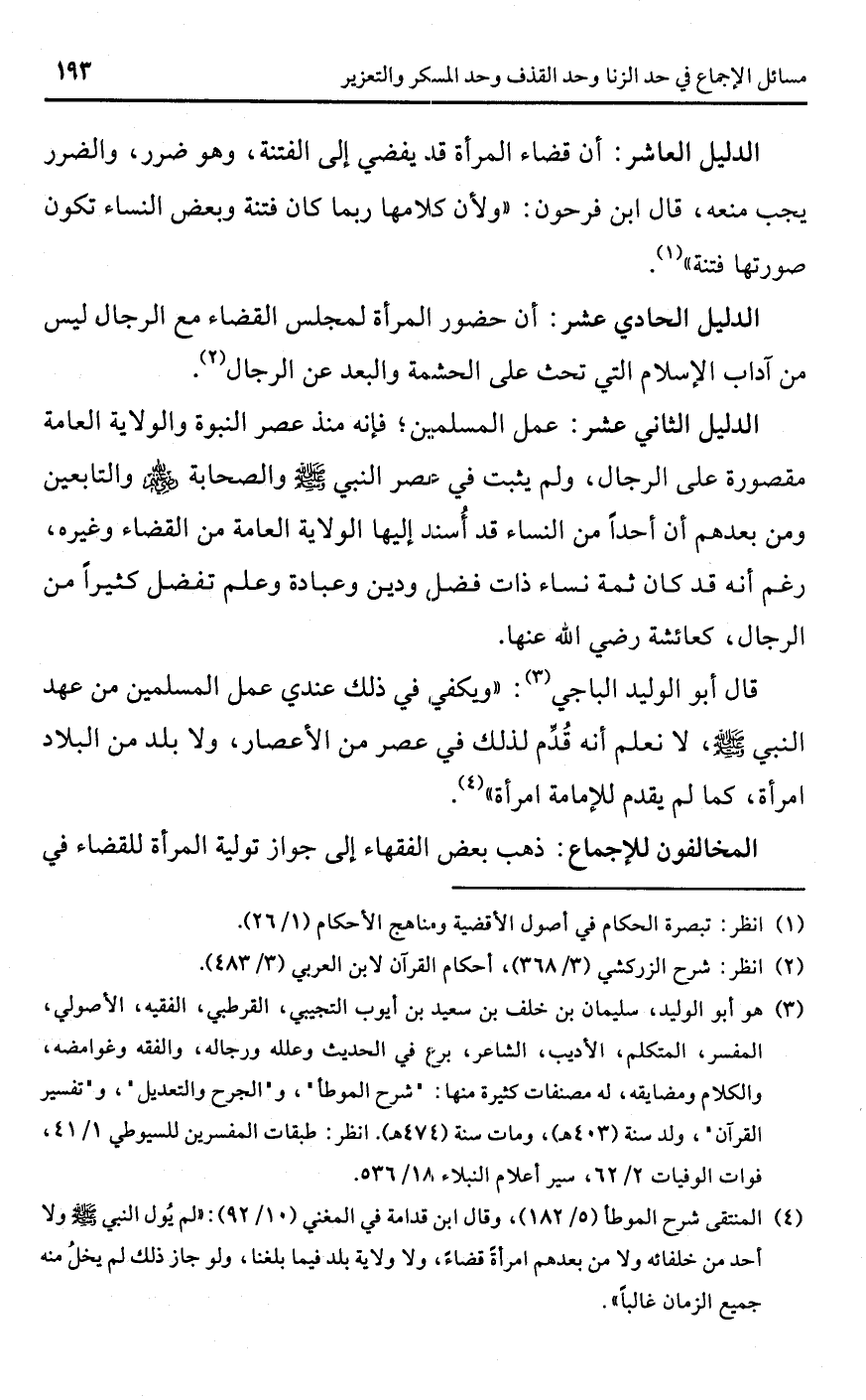 (¬4) المنتقى شرح الموطأ (5/ 182)، وقال ابن قدامة في المغني (10/ 92): "لم يُول النبي -صلى اللَّه عليه وسلم- ولا أحد من خلفائه ولا من بعدهم امرأةً قضاءً، ولا ولاية بلد فيما بلغنا، ولو جاز ذلك لم يخلُ منه جميع الزمان غالبًا".