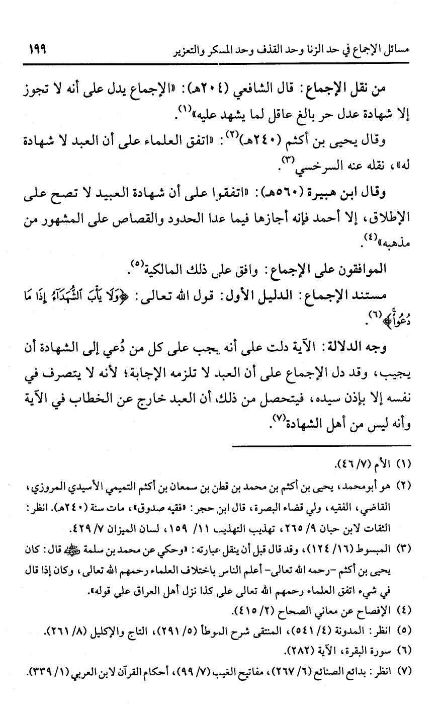 • من نقل الإجماع: قال الشافعي (204 هـ): "الإجماع يدل على أنه لا تجوز إلا شهادة عدل حر بالغ عاقل لما يشهد عليه" (¬1).