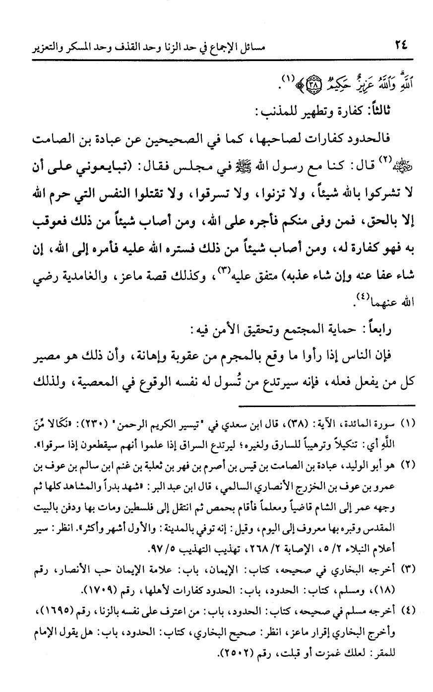 فالحدود كفارات لصاحبها، كما في الصحيحين عن عبادة بن الصامت -رضي اللَّه عنه- (¬2) قال: كنا مع رسول اللَّه -صلى اللَّه عليه وسلم- في مجلس فقال: (تبايعوني على أن لا تشركوا باللَّه شيئًا، ولا تزنوا، ولا تسرقوا، ولا تقتلوا النفس التي حرم اللَّه إلا بالحق، فمن وفى منكم فأجره على اللَّه، ومن أصاب شيئًا من ذلك فعوقب به فهو كفارة له، ومن أصاب شيئًا من ذلك فستره اللَّه عليه فأمره إلى اللَّه، إن شاء عفا عنه وإن شاء عذبه) متفق عليه (¬3)، وكذلك قصة ماعز، والغامدية رضي اللَّه عنهما (¬4).
