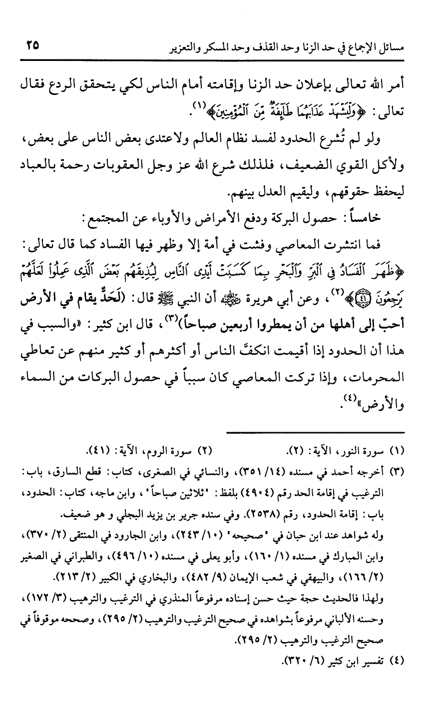 (¬3) أخرجه أحمد في مسنده (14/ 351)، والنسائي في الصغرى، كتاب: قطع السارق، باب: الترغيب في إقامة الحد رقم (4904) بلفظ: "ثلاثين صباحًا"، وابن ماجه، كتاب: الحدود، باب: إقامة الحدود، رقم (2538). وفي سنده جرير بن يزيد البجلي وهو ضعيف.